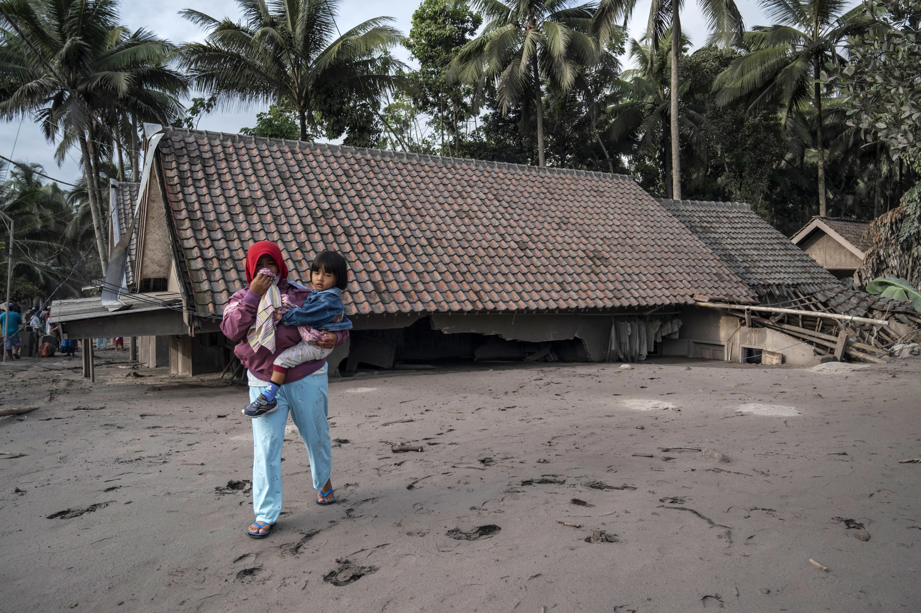 Villagers walk next to houses covered in volcanic ash at Sumber Wuluh village in Lumajang on December 5, 2021, after the Semeru volcano eruption that killed at least 13 people. (Photo by Juni Kriswanto/AFP Photo)