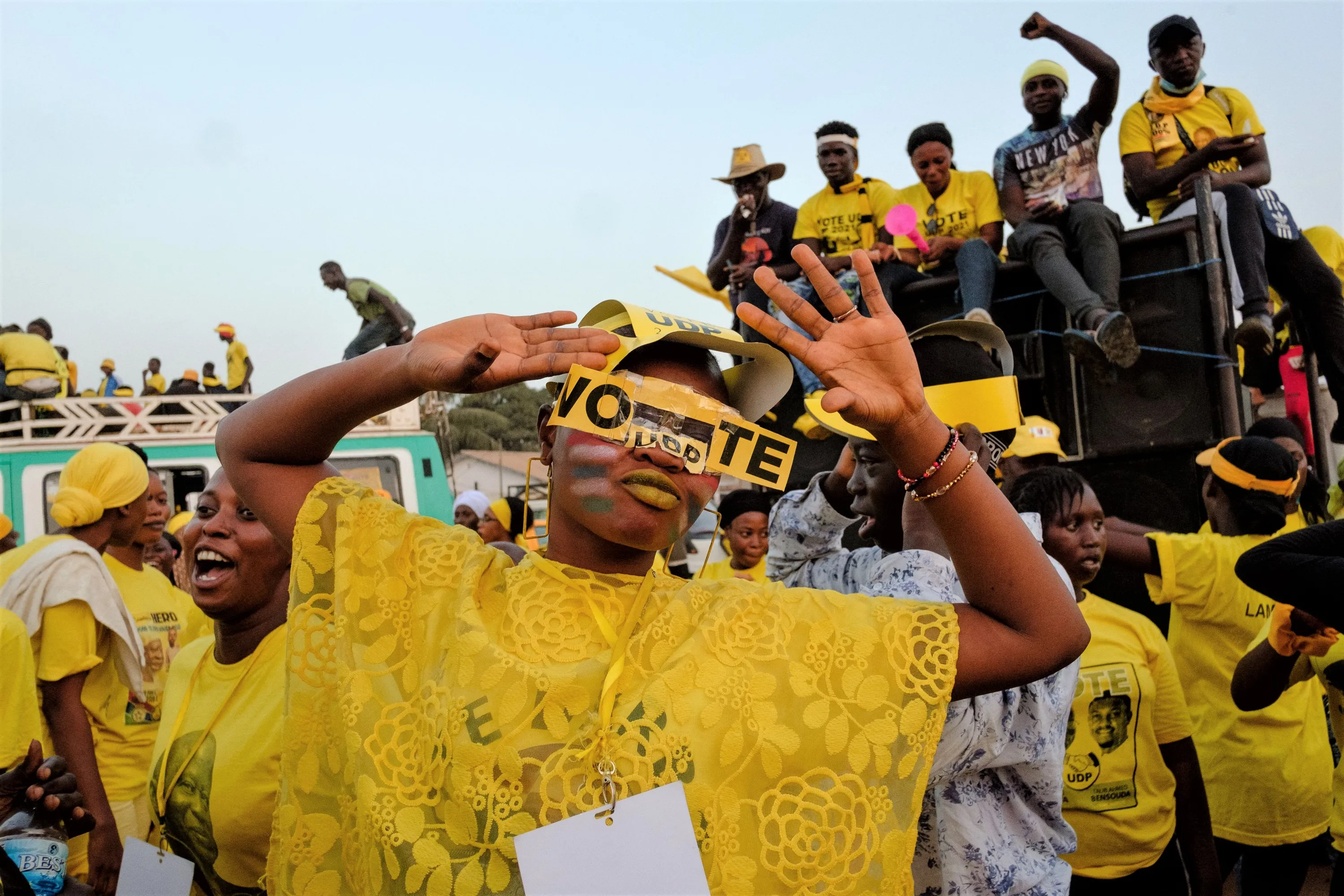 Supporters dance and sing during an election rally in support of Ousainou Darboe, former Gambian vice president and leader of the main opposition party, the United Democratic Party (UDP), in Banjul on December 2, 2021, two days ahead of presidential elections. Gambians go to the polls on December 4 to pick a president, in the poor West African country's first elections since ex-dictator Yahya Jammeh fled into exile nearly five years ago. (Photo by Guy Peterson/AFP Photo)