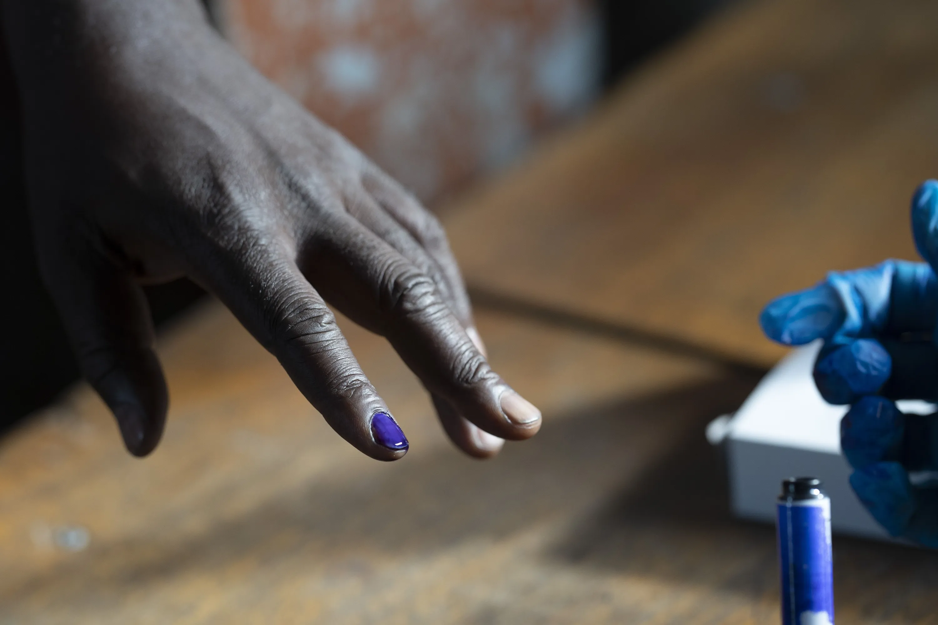 A man has his nail inked before casting his ballot for Gambia's presidential elections, in Banjul, Gambia, Saturday, December 4, 2021. (Photo by Leo Correa/AP Photo)