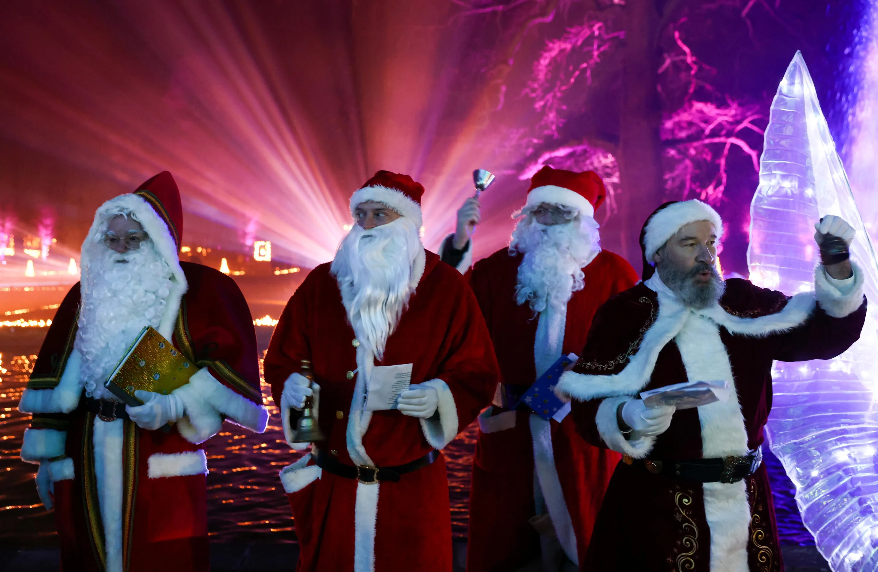 People dressed as Santa Claus sing Christmas songs during the annual meeting of the rent-a-Santa Claus service in Berlin, Germany, November 28, 2021. (Photo by Christian Mang/Reuters)