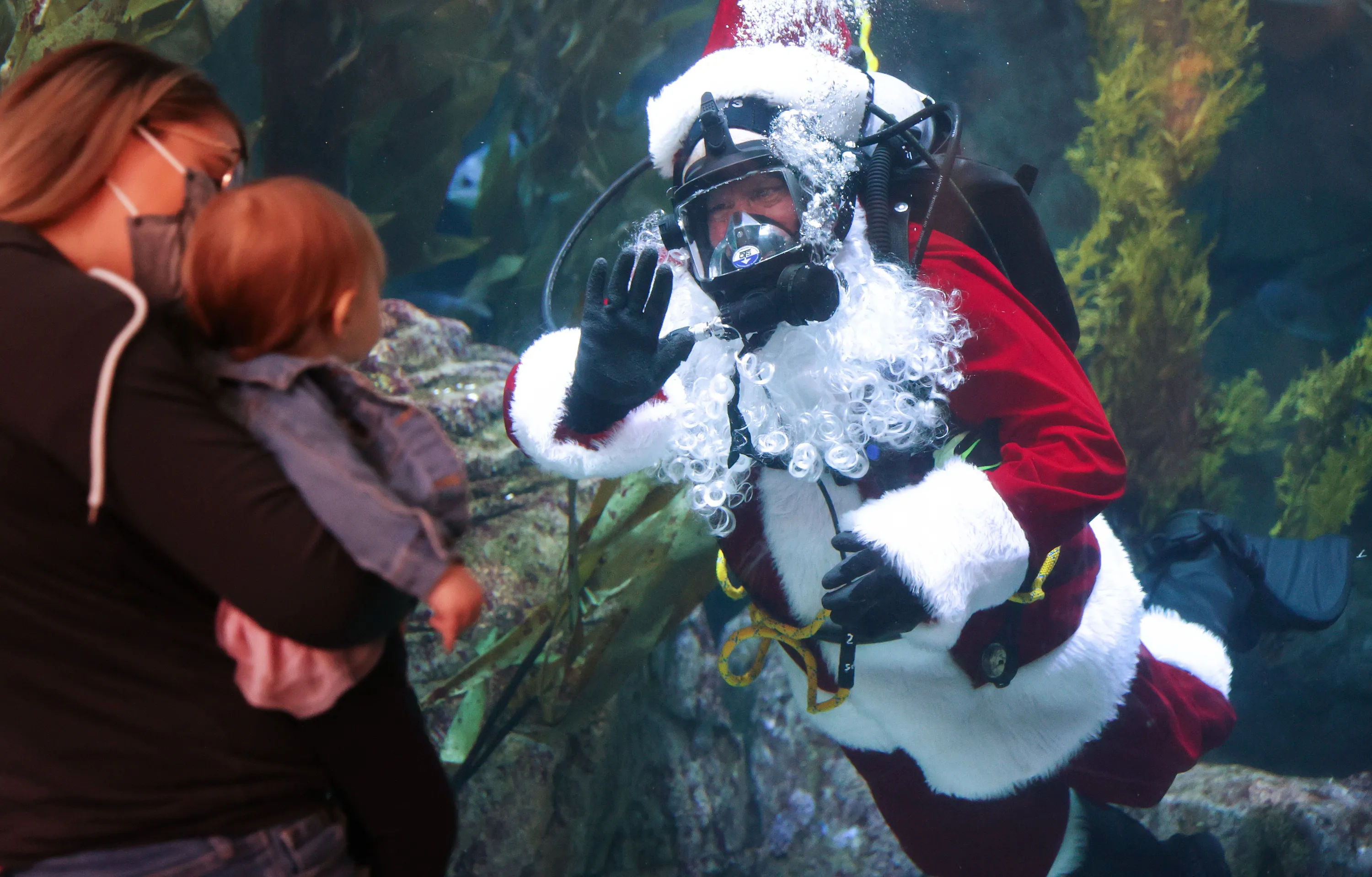 A diver wearing a Santa Claus costume waves to visitors while swimming with kelp forest fish during a press preview of the Aquarium of the Pacific’s celebration of the holiday season on December 1, 2021 in Long Beach, California. The celebration starts December 4th with the ‘Holiday Treats for the Animals’ festival and runs through December 23rd. (Photo by Mario Tama/Getty Images)