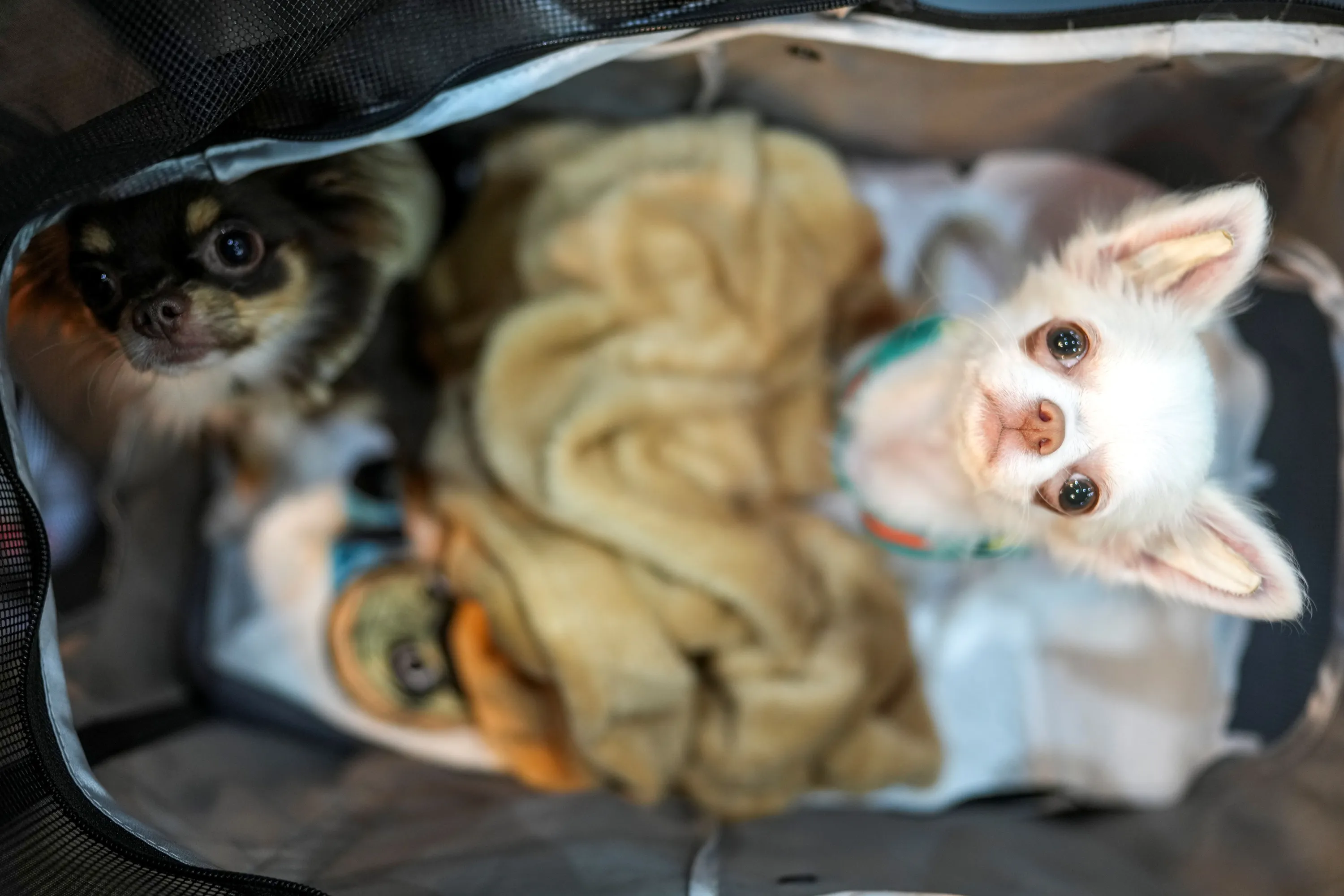Dogs inside a pram look up, at the annual Pet Expo 2021 in Bangkok, Thailand, November 25, 2021. (Photo by Athit Perawongmetha/Reuters)