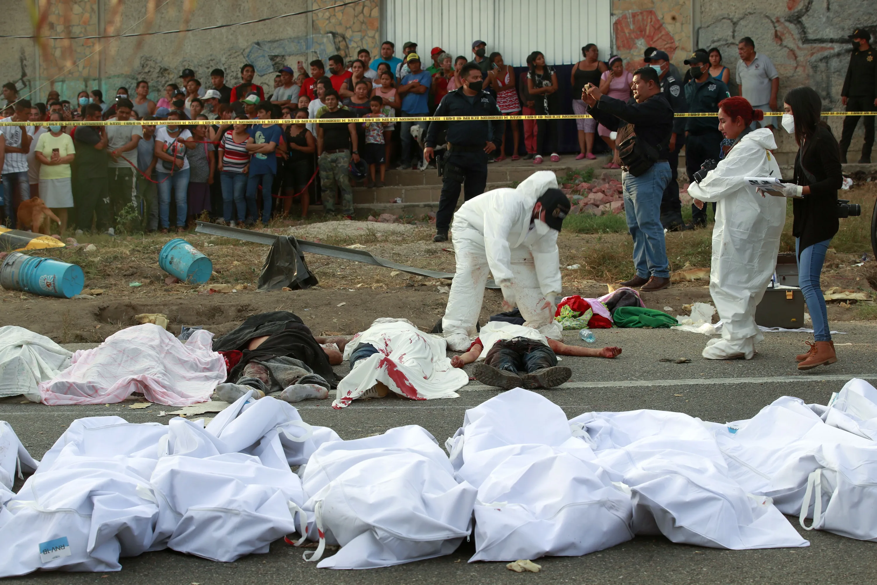 Bodies in bodybags are placed on the side of the road after an accident in Tuxtla Gutierrez, Chiapas state, Mexico, December 9, 2021. (Photo by AP Photo/Stringer)