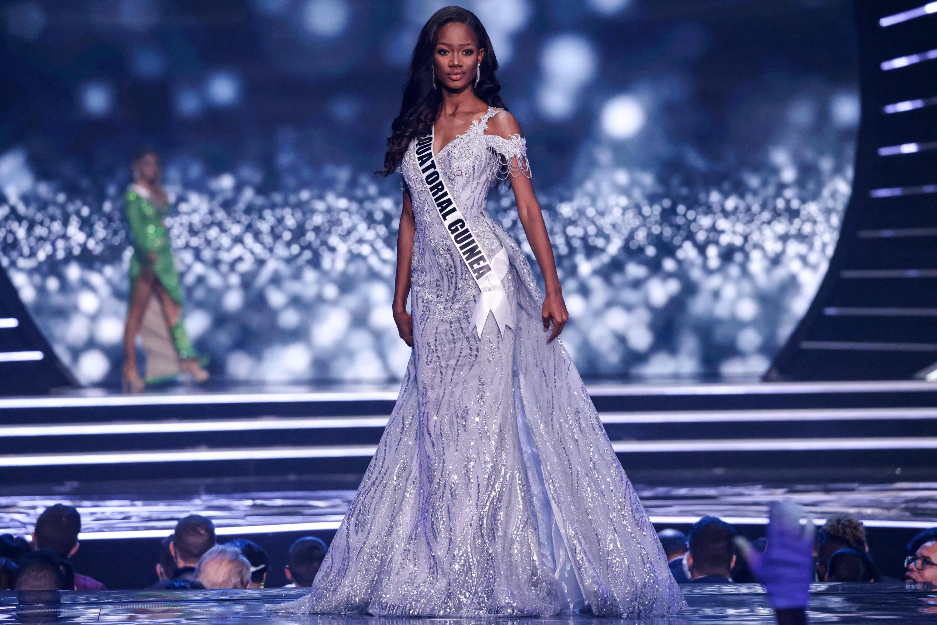 Miss Equatorial Guinea, Chelsea Martina Mituy, presents herself on stage during the preliminary stage of the 70th Miss Universe beauty pageant in Israel's southern Red Sea coastal city of Eilat on December 10, 2021. (Photo by Menahem Kahana/AFP Photo)