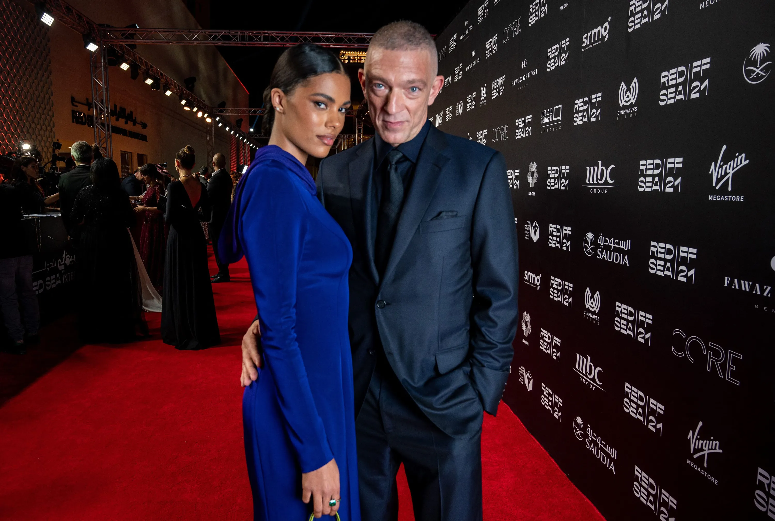 A handout picture released by the Red Sea Film Festival shows French actor Vincent Cassel and wife Tina Kunakey on the red carpet during the opening ceremony of the 4th edition of the Red Sea film festival in the Saudi city of Jeddah, on December 6, 2021. (Photo by Ammar Abd Rabbo/Red Sea Film Festival/AFP Photo)