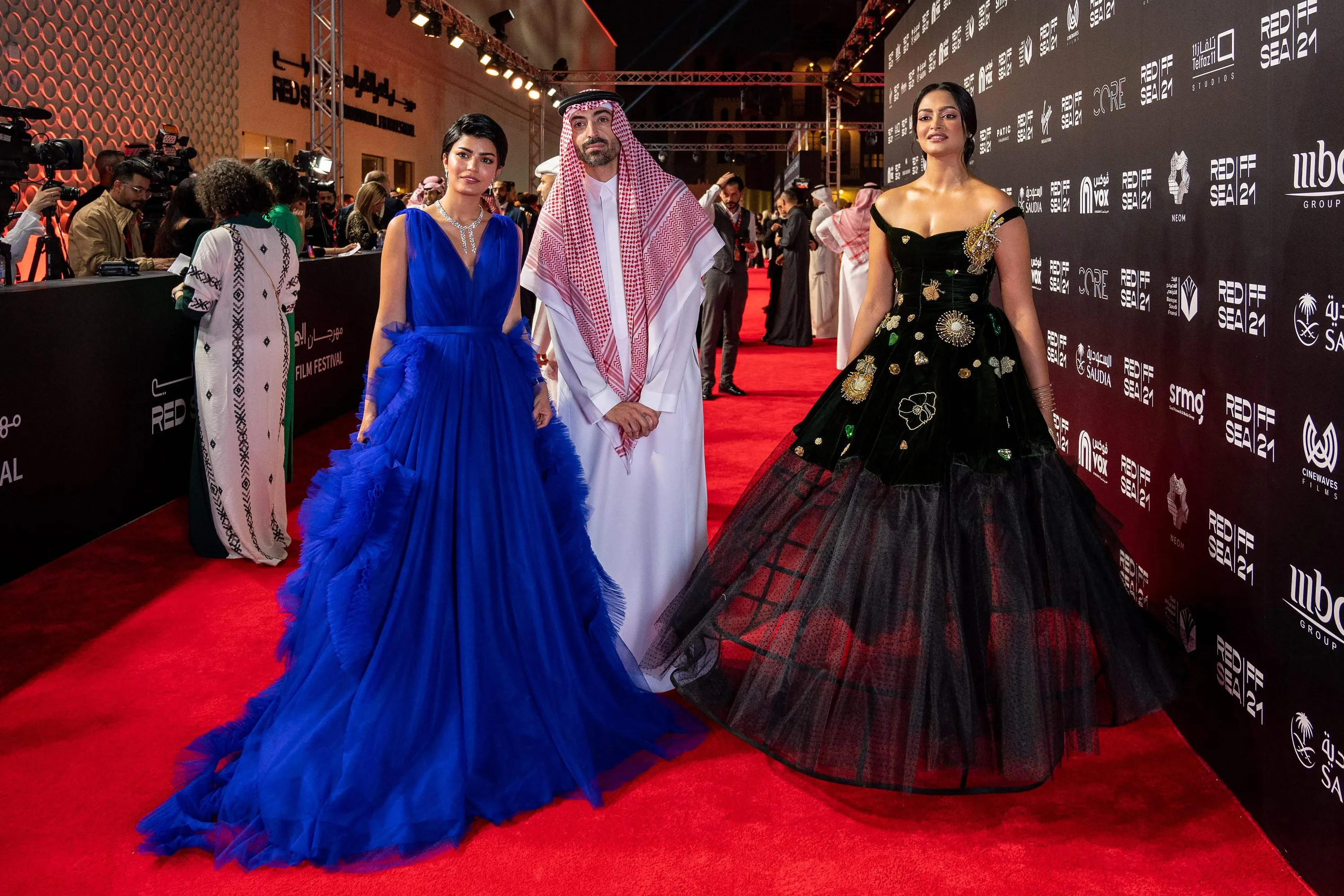 A handout picture released by the Red Sea Film Festival shows Saudi actress Mila Al Zahrani and Saudi producer and Chairman of the Festival Mohammed Al Turki and actress Fay Fouad on the red carpet during the opening ceremony of the 4th edition of the Red Sea film festival in the Saudi city of Jeddah, on December 6, 2021. (Photo by Ammar Abd Rabbo/Red Sea Film Festival/AFP Photo)