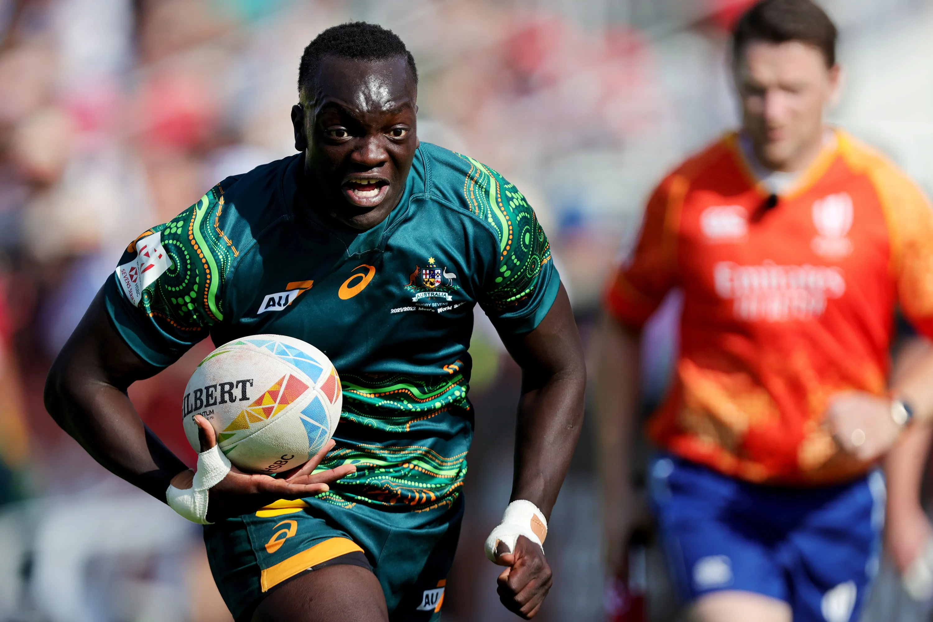 Yool Yool of Australia runs with the ball to score a try during the match between Australia and Canada on Day One of the HSBC World Rugby Sevens Series - Dubai at The Sevens Stadium on December 03, 2021 in Dubai, United Arab Emirates. (Photo by Christopher Pike/Getty Images)
