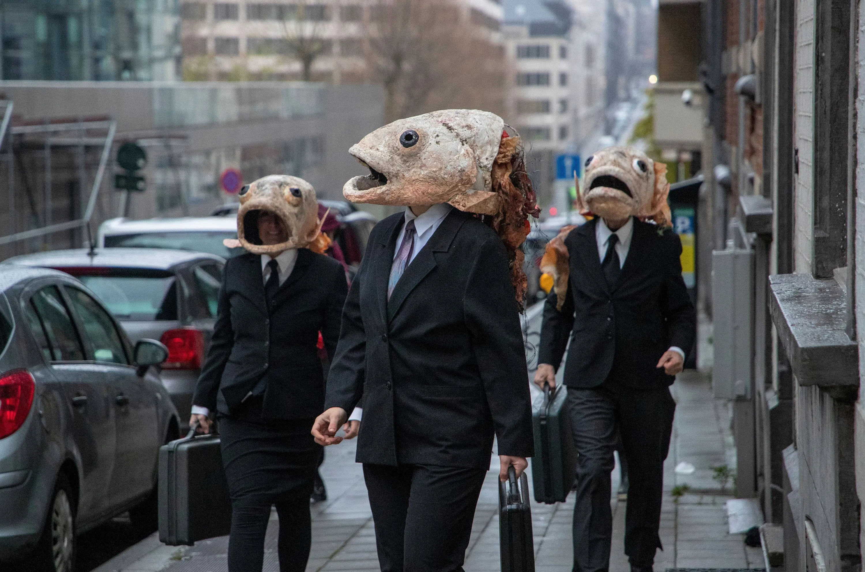 Illustration shows an action “When the sea dies, we die with it” by Ocean Rebellion, a daughter movement of Extinction Rebellion, in front if the European Commission headquarters, in Brussels, Sunday 12 December 2021. The activists will show blindfolded ministers standing in a pool of fish and blood in a theatrical way. With this campaign, Ocean Rebellion wants to draw attention to the fishing quotas set by the European ministers. (Photo by Rex Features/Shutterstock)