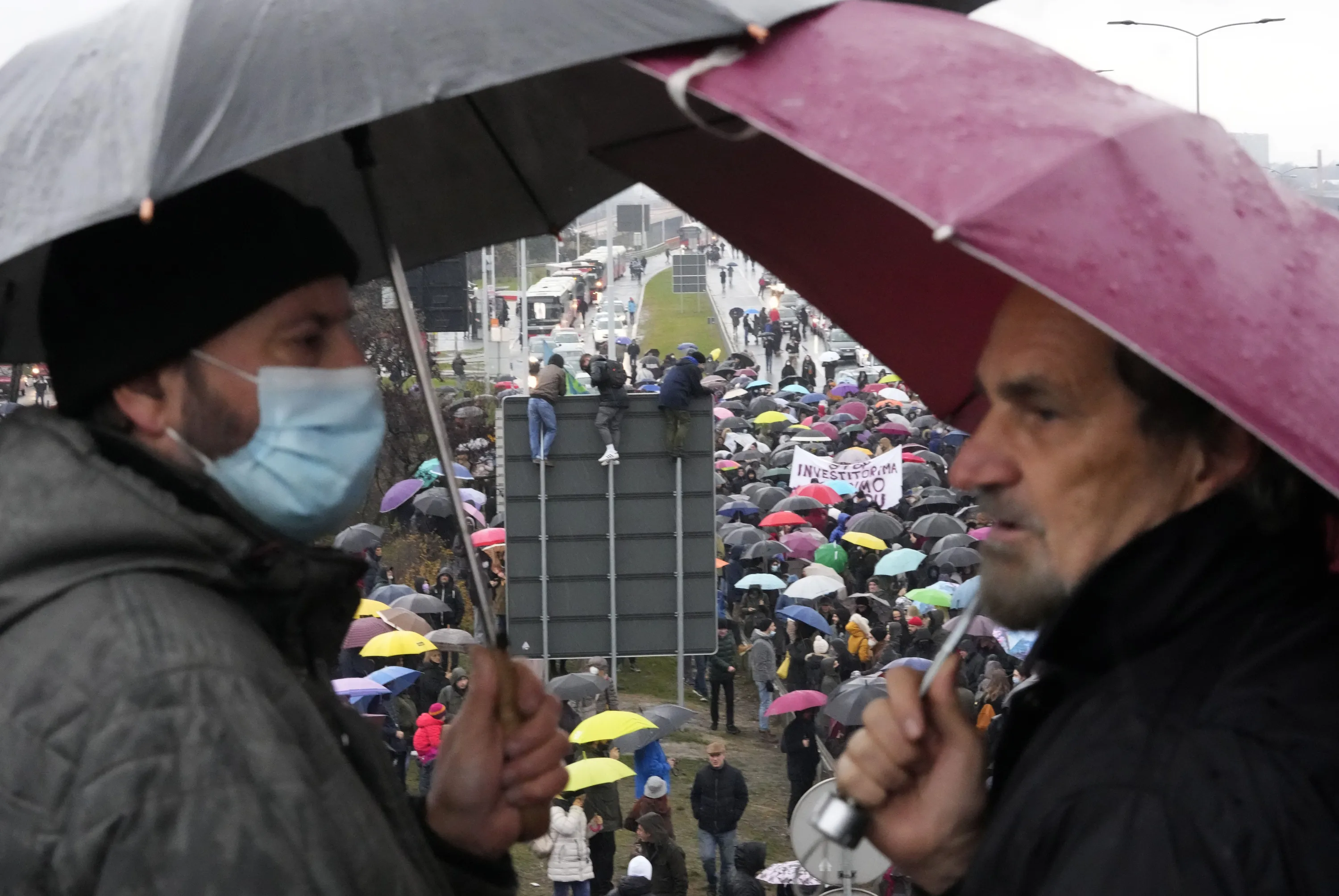 Protesters stand on the highway during a protest in Belgrade, Serbia, Saturday, December 11, 2021. Environmental protesters blocked roads in Serbia for a third consecutive weekend to oppose plans for lithium mining, despite a bid by the country's populist government to defuse the demonstrations by agreeing to the key demands of organizers. (Photo by Darko Vojinovic/AP Photo)