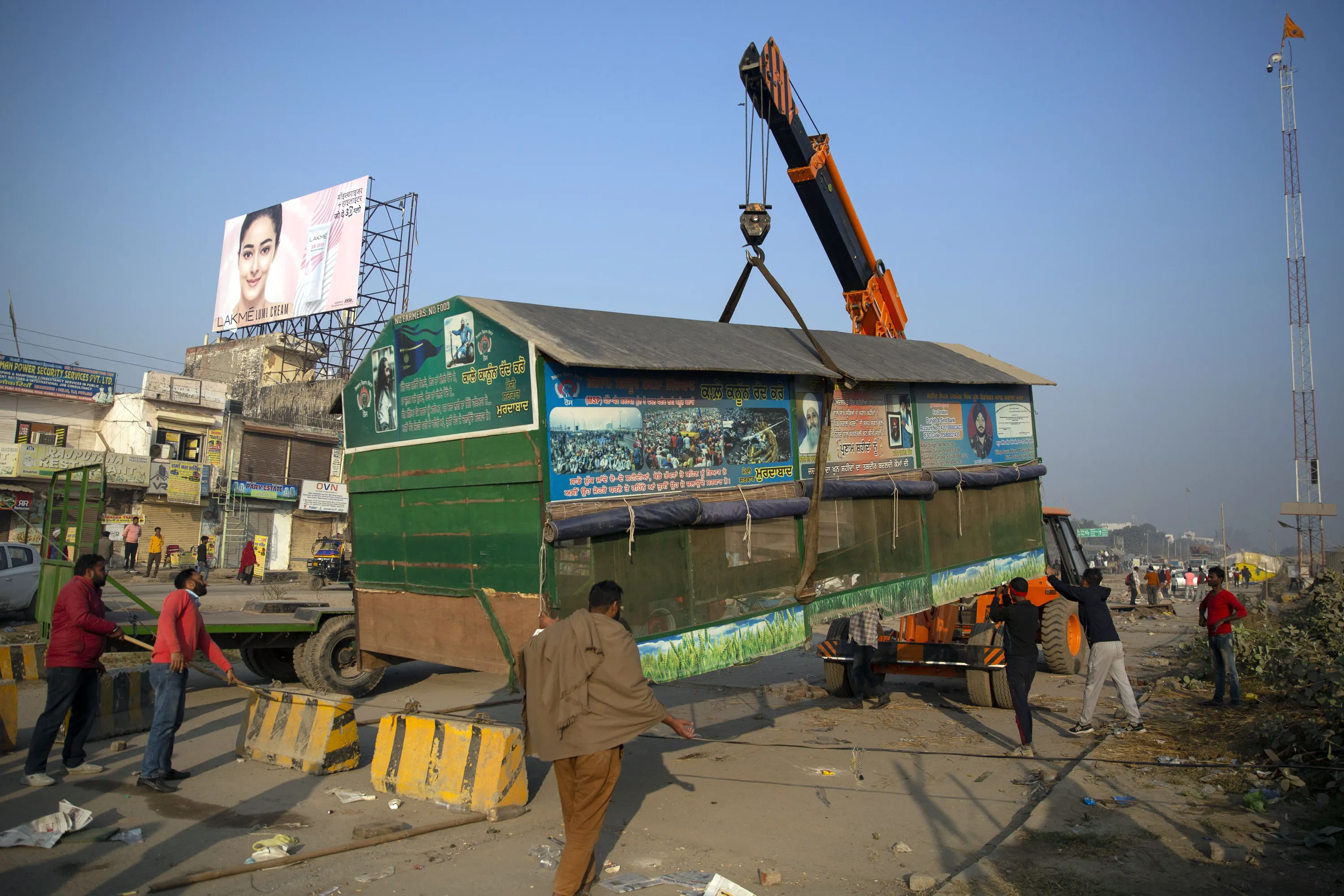 Indian farmers use a crane to lift a temporary structure used during protests as they start vacating the protest site in Singhu, on the outskirts of New Delhi, India, Saturday, December 11, 2021. Tens of thousands of jubilant Indian farmers on Saturday cleared protest sites on the capital’s outskirts and began returning home, marking an end to their year-long demonstrations against agricultural reforms that were repealed by Prime Minister Narendra Modi's government in a rare retreat. (Photo by Altaf Qadri/AP Photo)