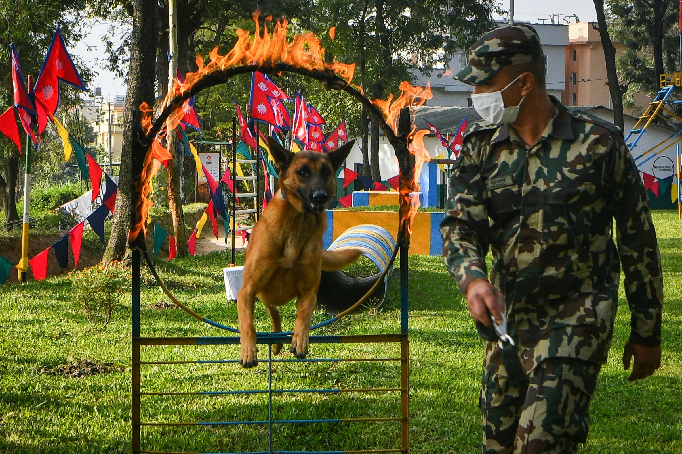 A Nepal Army dog handler with his dog display training skills during an event to mark the Hindu Tihar festival similar as Diwali at the Nepal Army Police Dog Training School in Sano Thimi on the outskirts of Kathmandu on November 3, 2021. (Photo by Prakash Mathema/AFP Photo)