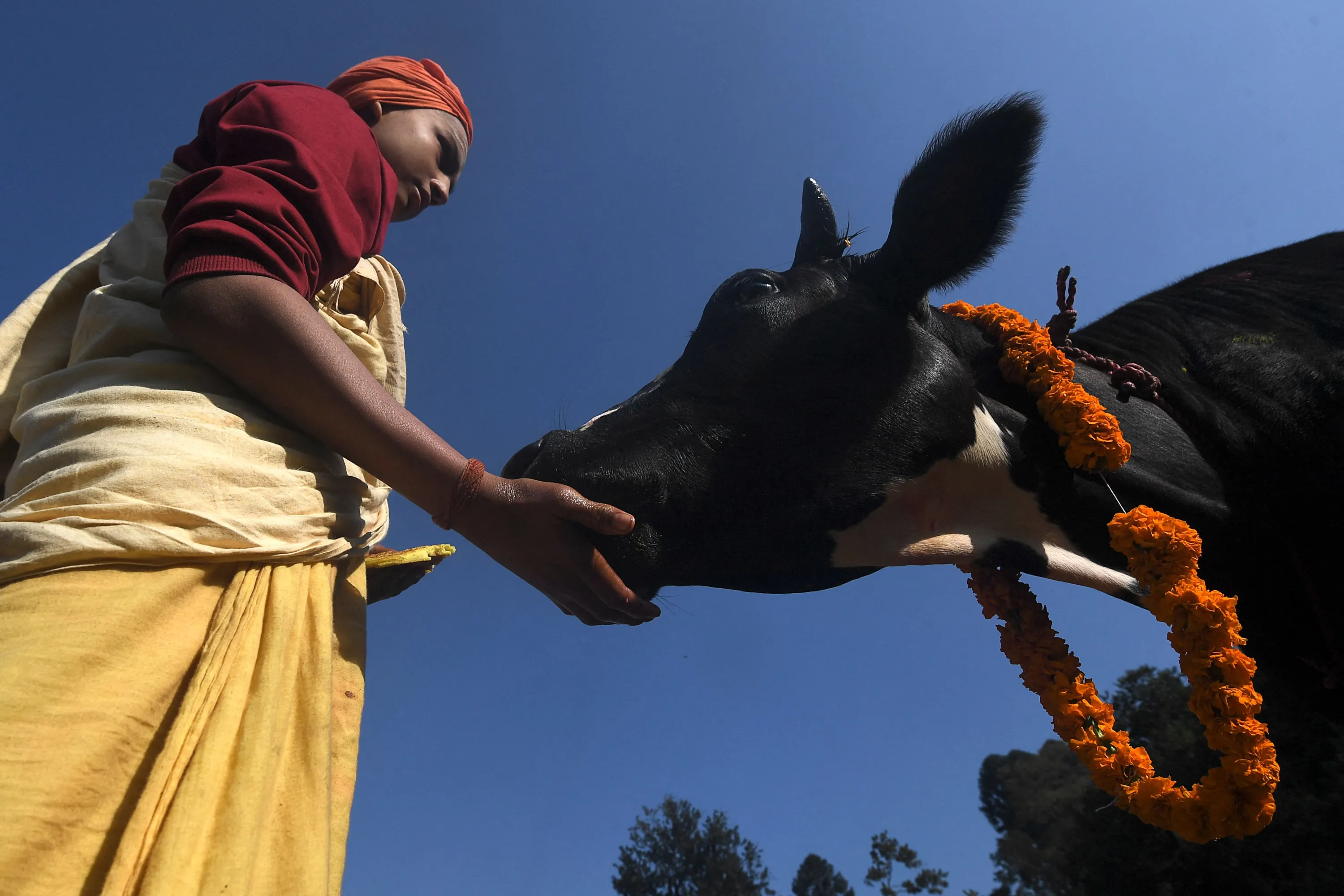 A Hindu devotee worships a cow regarded as an incarnation of the Hindu Goddess Laxmi during Tihar, the festival of lights that is celebrated at the same time as Diwali, in Kathmandu on November 4, 2021. (Photo by Prakash Mathema/AFP Photo)