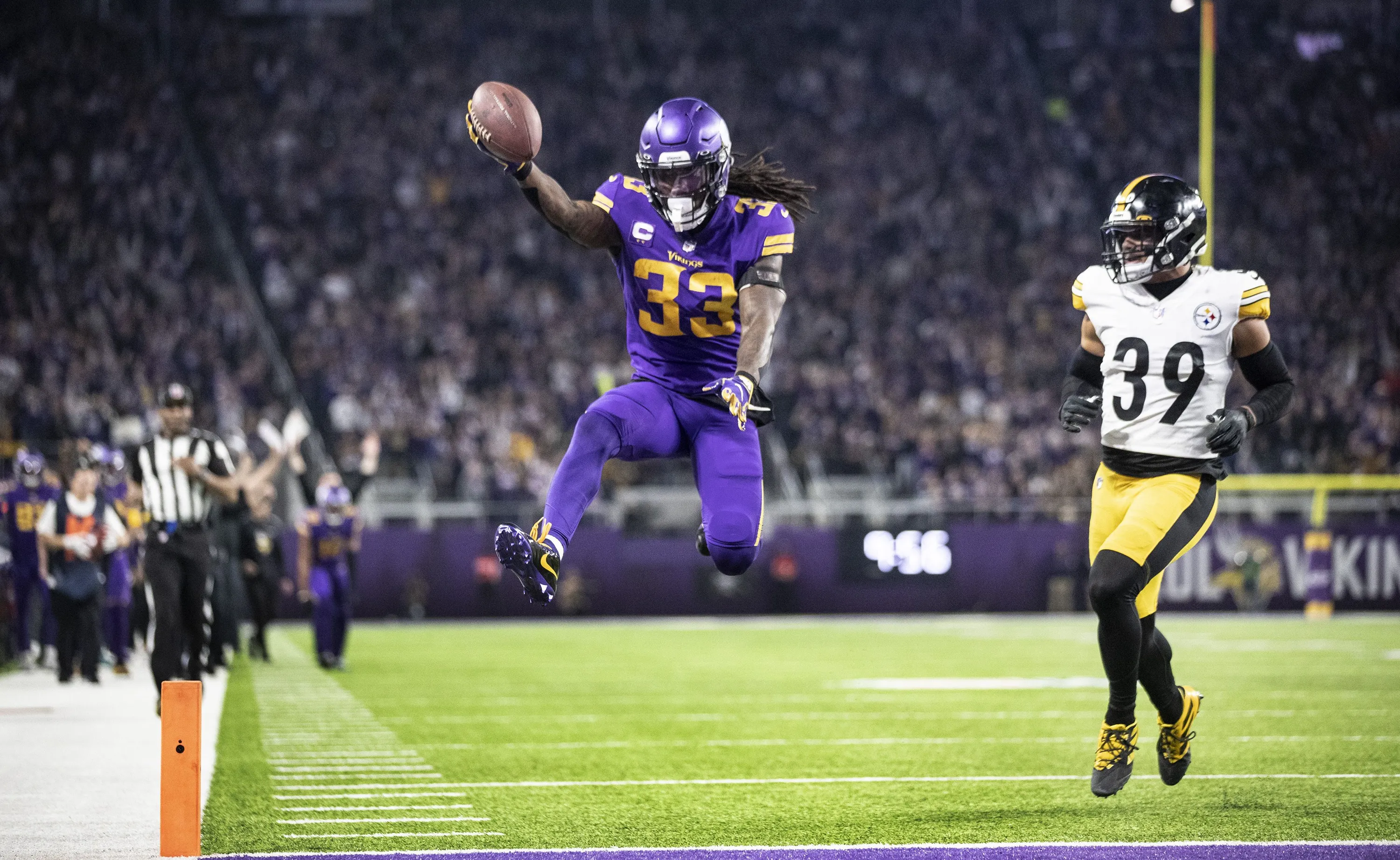 Minnesota Vikings running back Dalvin Cook (33) jumps into the end zone near Pittsburgh Steelers free safety Minkah Fitzpatrick (39) for a touchdown run in the second quarter of an NFL football game in Minneapolis, Thursday, December 9, 2021. (Photo by Jerry Holt/Star Tribune via AP Photo)