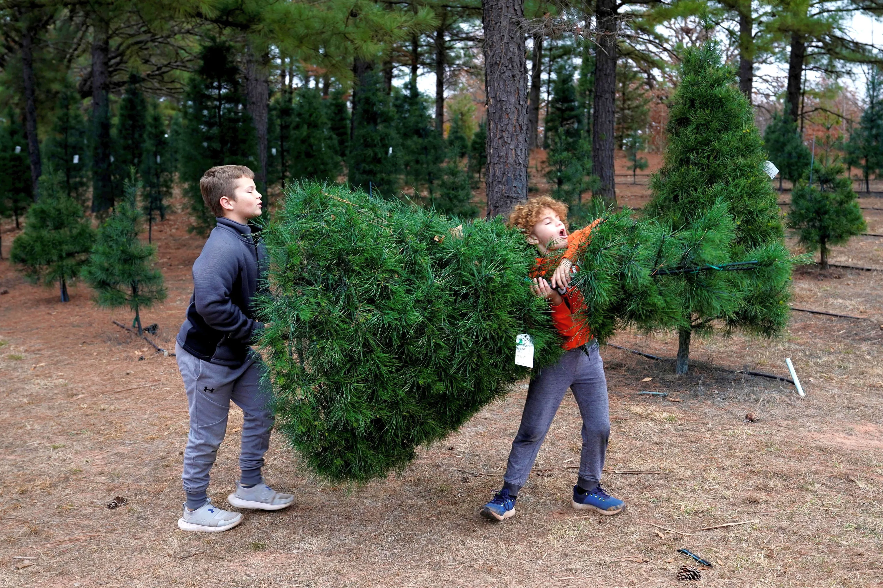 Ash Foster and his brother Cru carry their freshly harvested Christmas tree at Sorghum Mill Christmas Tree Farm in Edmond, Oklahoma, U.S., December 4, 2021. (Photo by Nick Oxford/Reuters)