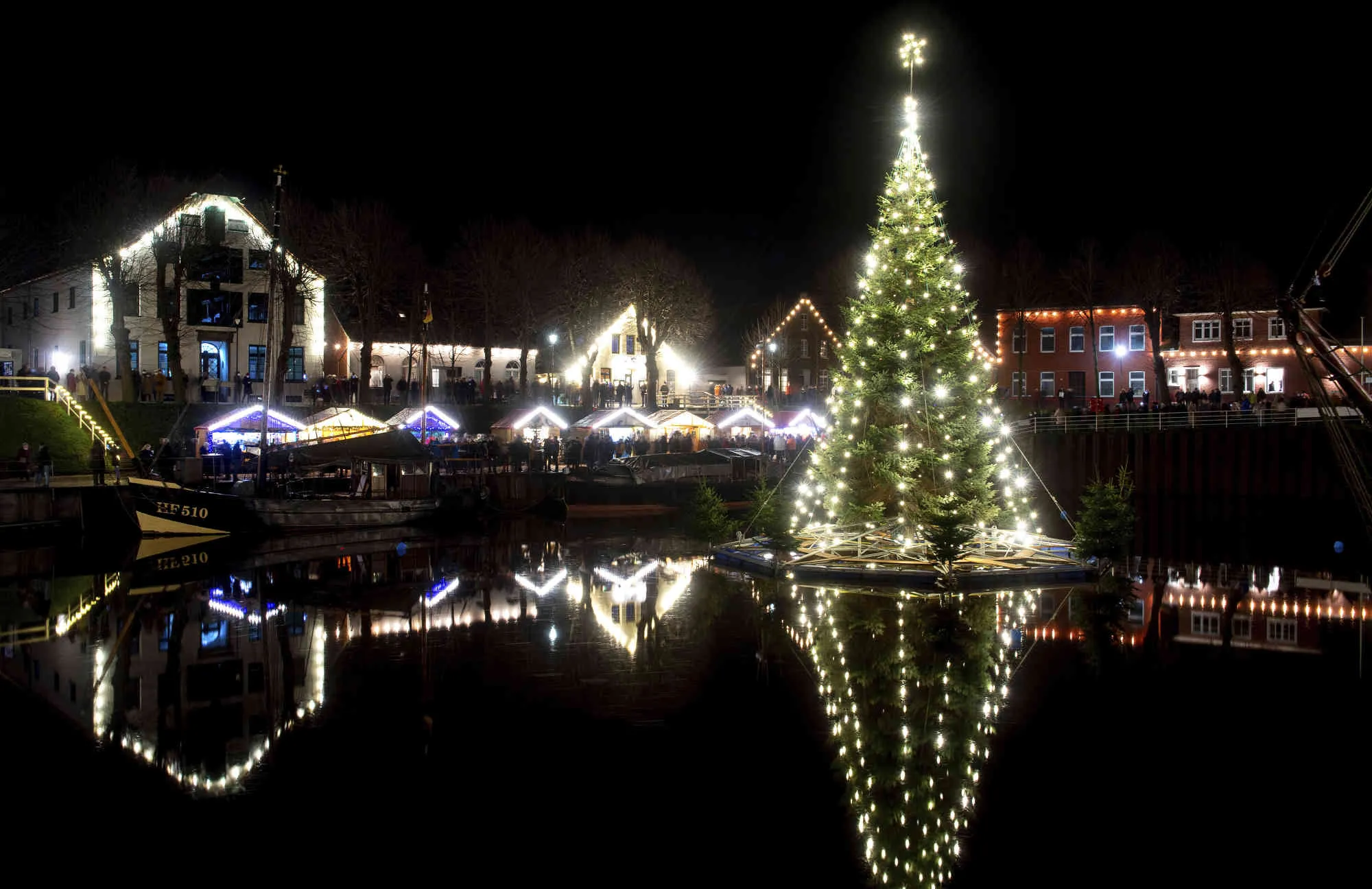 The floating Christmas tree lights up in the historic harbour of the village of Carolinensiel, Germany, Saturday, November 27, 2021. (Photo by Hauke-Christian Dittrich/dpa via AP Photo)