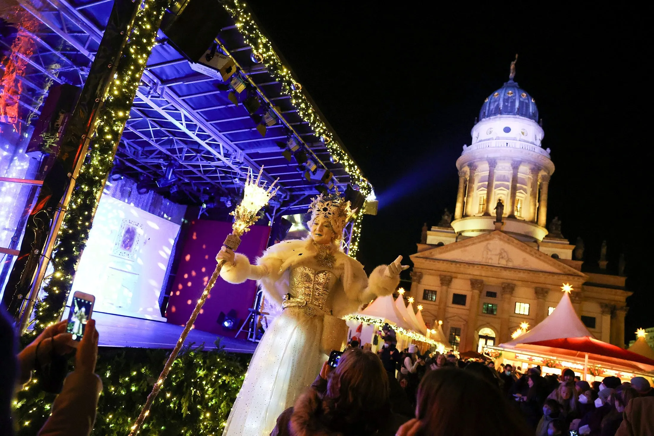 An artist dressed as Ice Queen gestures as people visit a Christmas market, amid the coronavirus disease (COVID-19) pandemic, at Gendarmenmarkt square in Berlin, Germany, November 22, 2021. (Photo by Christian Mang/Reuters)