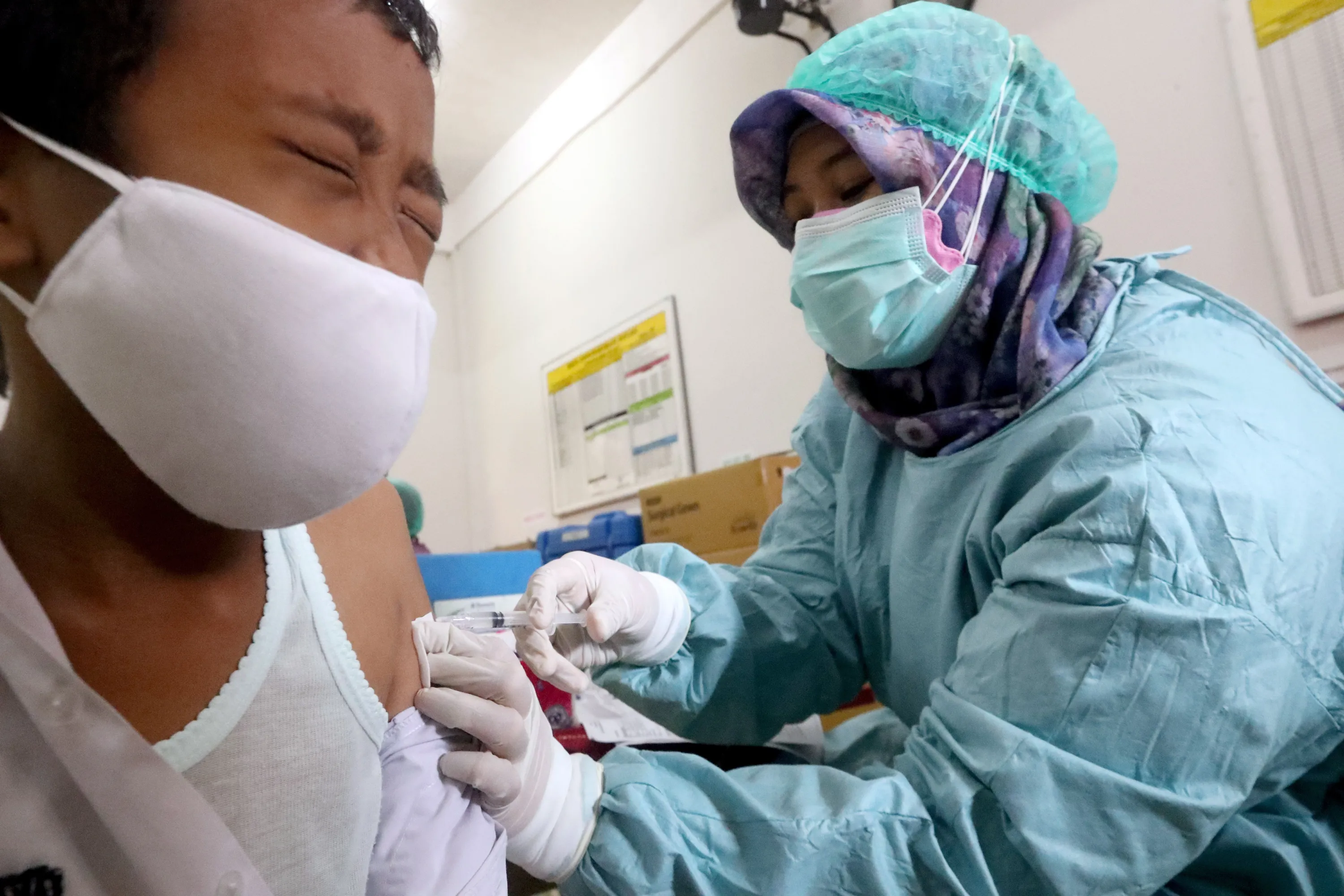 An Indonesian health worker gives a dose of COVID-19 vaccine to an elementary school student during a vaccination drive for children between the ages of six to 11, at an SDN 01 elementary school in Depok, West Java, Indonesia, 14 December 2021. The Indonesian government began COVID-19 vaccinations for children between the ages of six and 11. Government data shows about 26.5 million children have been targeted for vaccination, and the country has reported that more than 4.2 million coronavirus infections with cases among children aged 0 to 18, making up 13 percent of total infections in Indonesia. (Photo by Bagus Indahono/EPA/EFE)