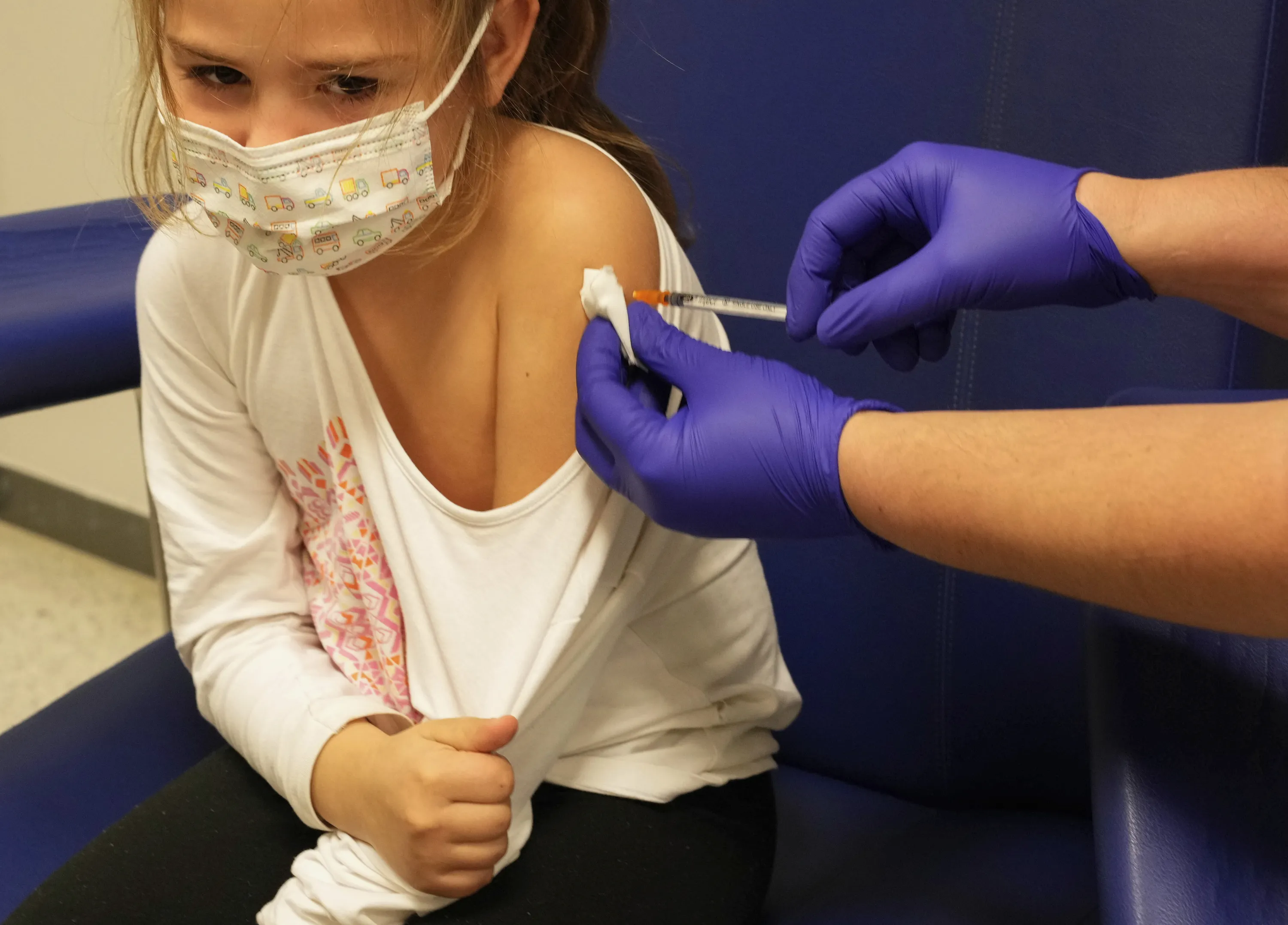 A young girl receives a vaccine as children are administered the first shot of the Pfizer COVID-19 vaccine at Hospital de Henares in Coslada, Madrid, Wednesday, December 15, 2022. Starting from Wednesday, Spain is trying to begin a speedy vaccination rollout for around 3.3 million children aged 5-11, the group that is leading contagion rates in the country and largely believed to be spreading new infections to their parents and grandparents. (Photo by Bernat Armangue/AP Photo)