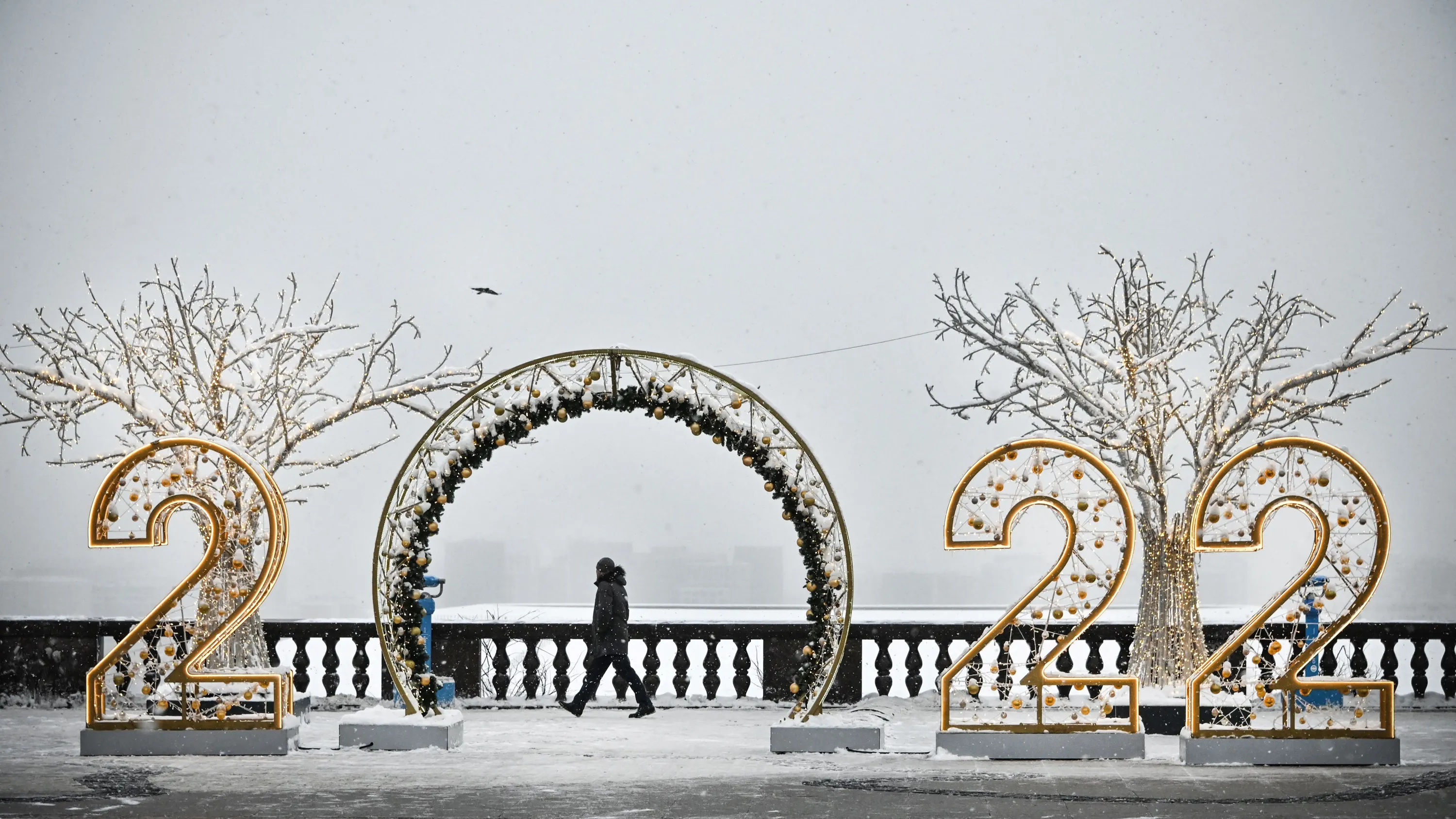 A man walks past large numbers for the upcoming year 2022, as part of Christmas and New Year decorations at Vorobyovy Hills observation point in Moscow, Russia on December 15, 2021. (Photo by Alexander Nemenov/AFP Photo)