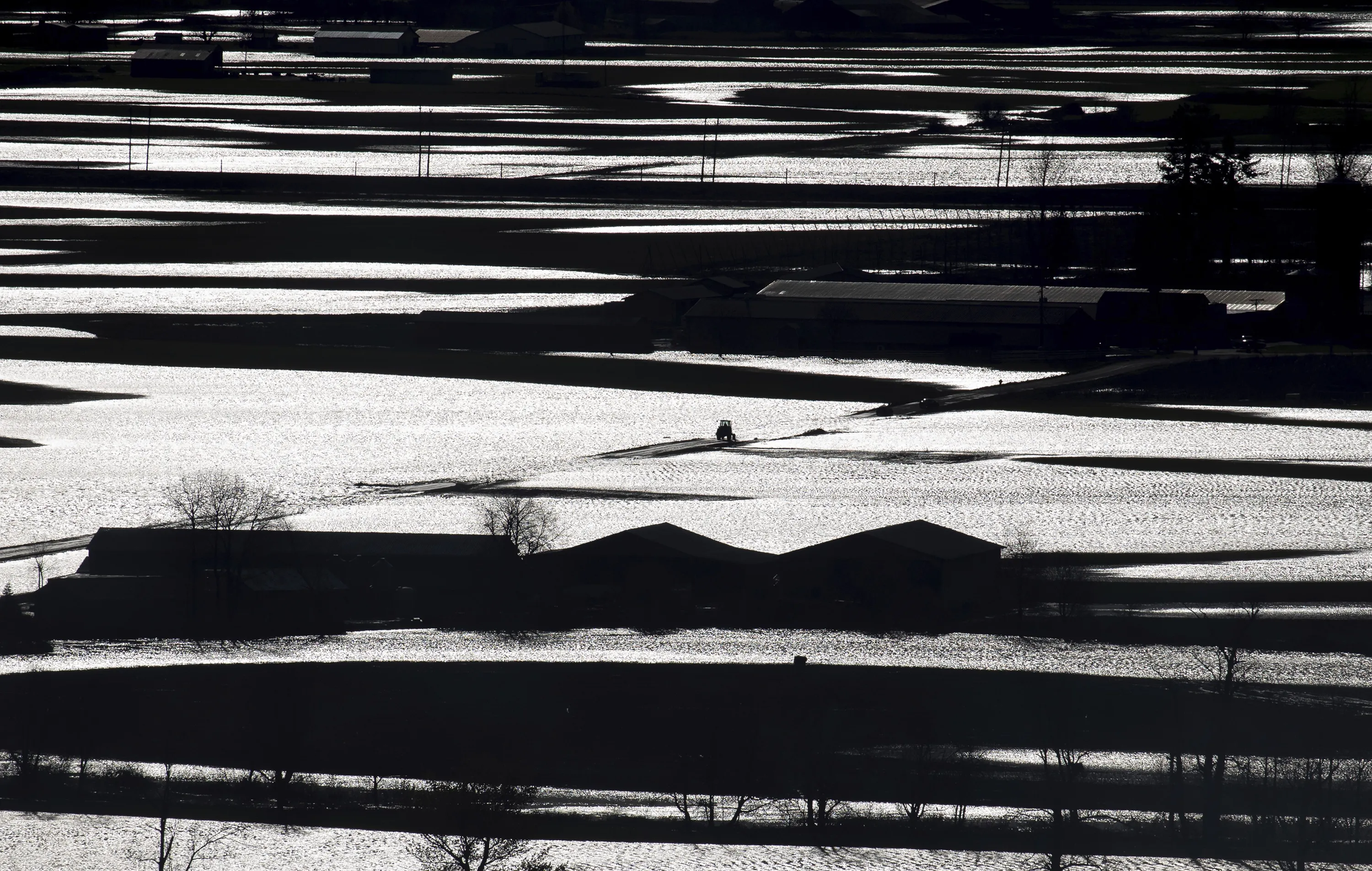 A tractor travels through flooded farmland on a road partially covered with water in Abbotsford, British Columbia, Wednesday, November 17, 2021. (Photo by Darryl Dyck/The Canadian Press via AP Photo)