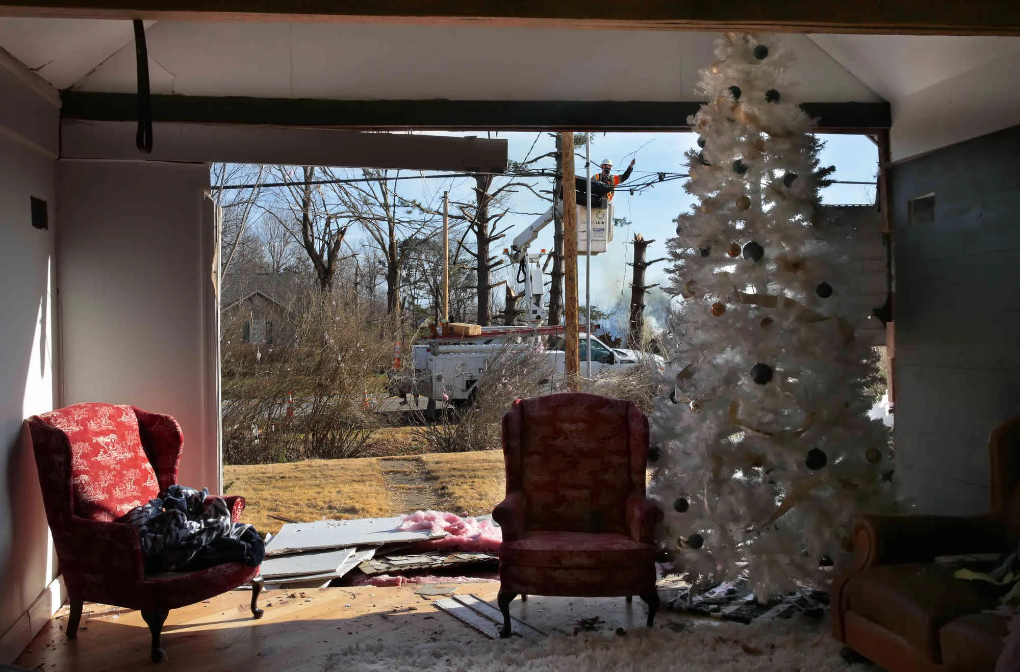 Utility crews from CenturyLink work to restore service outside a home where a Christmas tree stands in its living room at the corner of Highways F and 94 in Defiance, Mo. as cleanup continues from last Friday's tornado on Tuesday, December 14, 2021. (Photo by Robert Cohen/St. Louis Post-Dispatch via AP Photo)