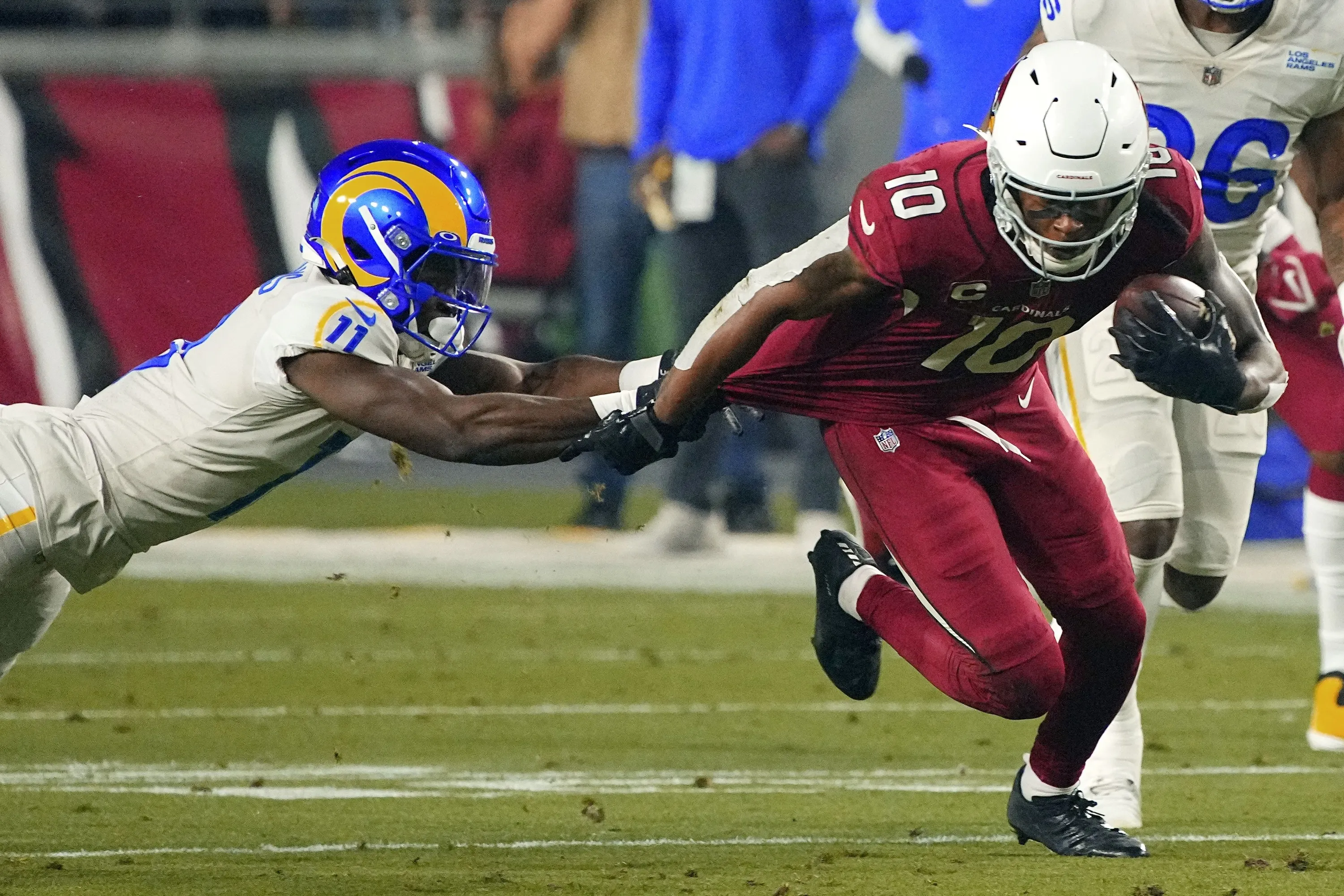 Arizona Cardinals wide receiver DeAndre Hopkins (10) is pulled down by Los Angeles Rams cornerback Darious Williams (11) during the first half of an NFL football game Monday, December 13, 2021, in Glendale, Ariz. (Photo by Rick Scuteri/AP Photo)
