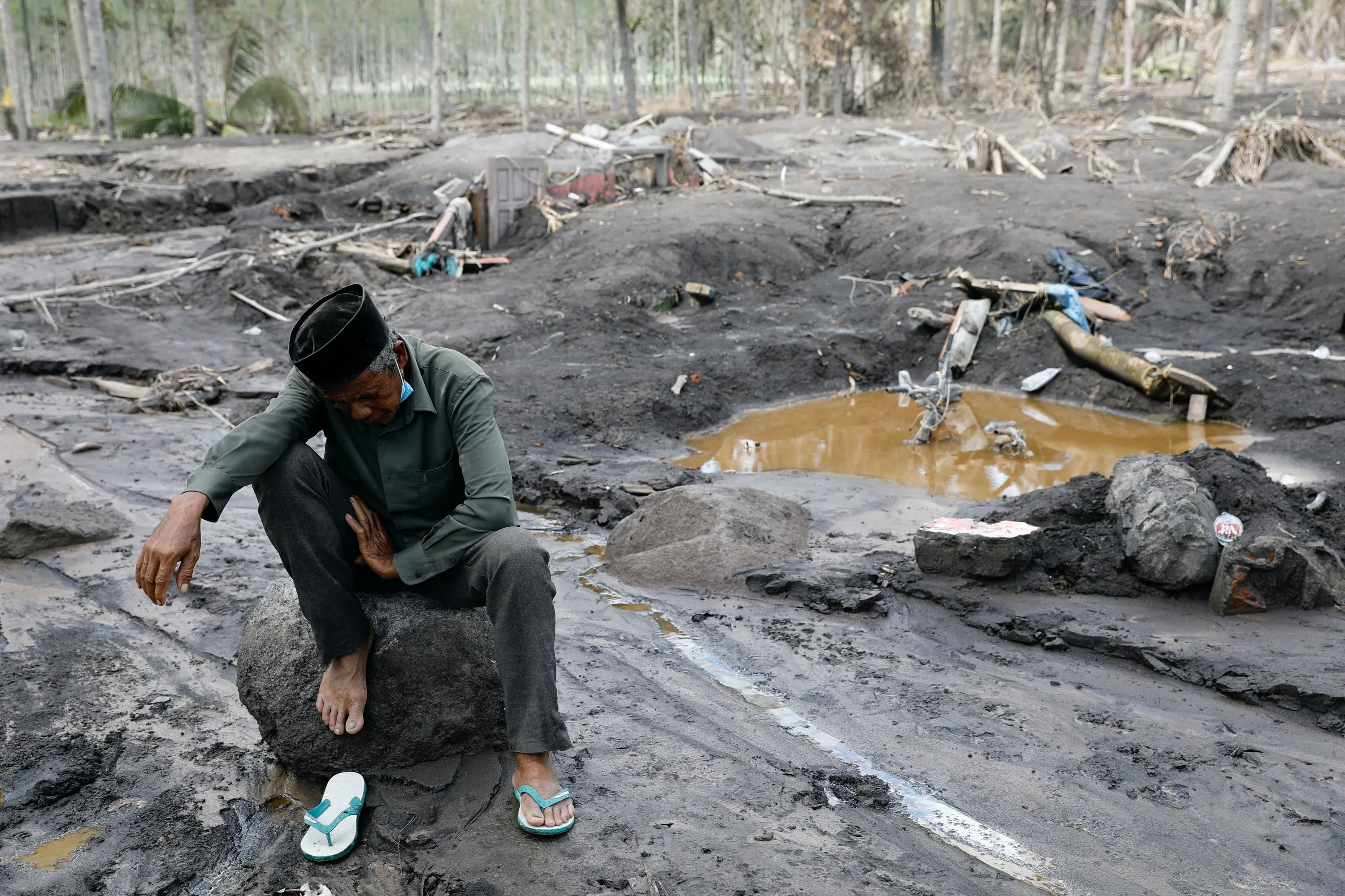 Musmin, 55, a local who lost his grandchild, rests on a rock while visiting the area that he believes is where his grandchild is buried following the Mount Semeru volcano eruption in Sumberwuluh, Candipuro district, Lumajang, East Java province, Indonesia, December 10, 2021. (Photo by Willy Kurniawan/Reuters)