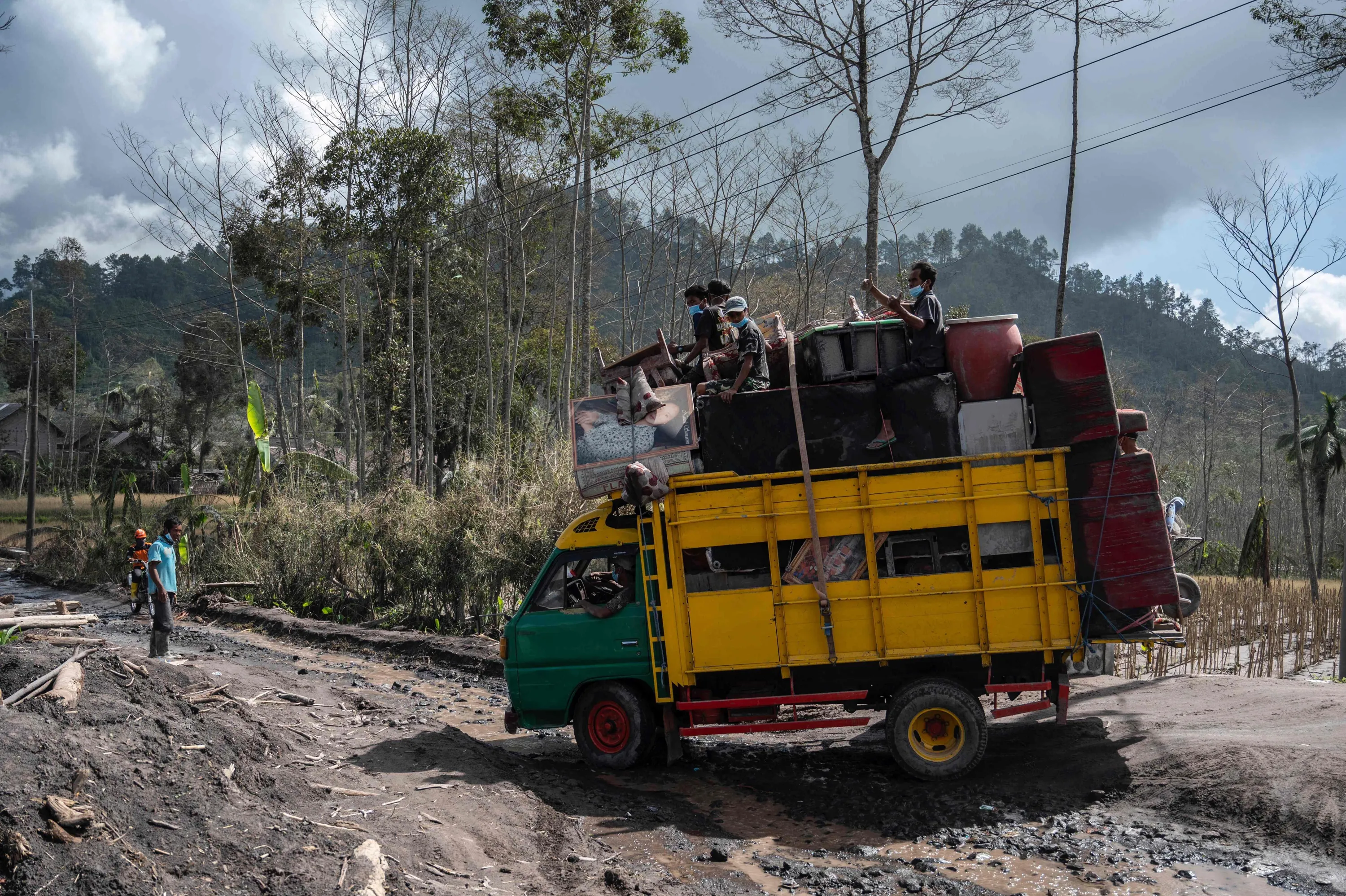 Villagers evacuate from Curah Kobokan village in Lumajang on December 10, 2021, after Mount Semeru erupted on December 4 killing at least 39 people. (Photo by Juni Kriswanto/AFP Photo)