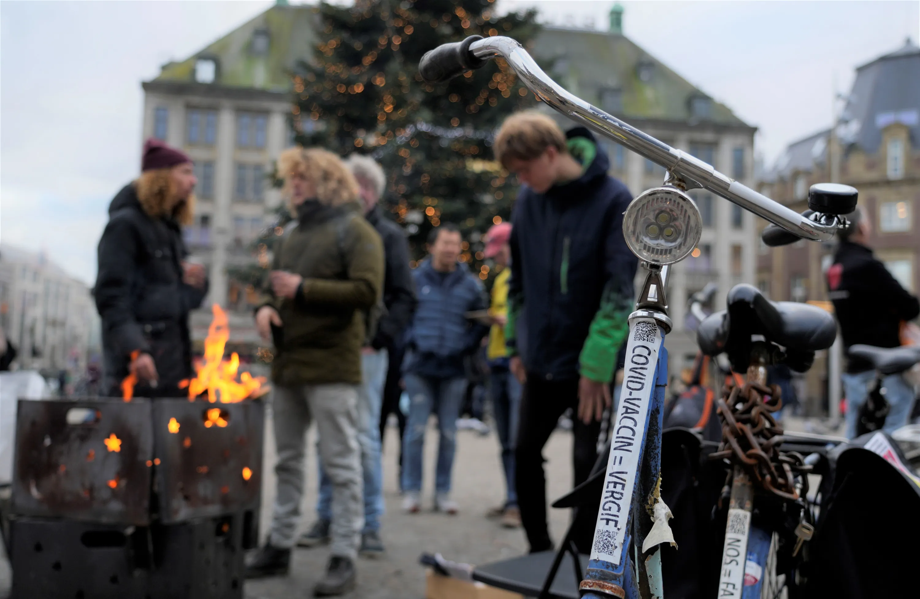People warm themselves by a fire, which promises to burn until COVID-19 measures are finished, in the center of Amsterdam, Monday, December 20, 2021. Nations across Europe have moved to reimpose tougher measures to stem a new wave of COVID-19 infections spurred by the highly transmissible omicron variant, with the Netherlands leading the way by imposing a nationwide lockdown. All non-essential stores, bars and restaurants in the Netherlands will be closed until Jan. 14. Sign on bike reads “Corona vaccine equals poison”. (Photo by Peter Dejong/AP Photo)