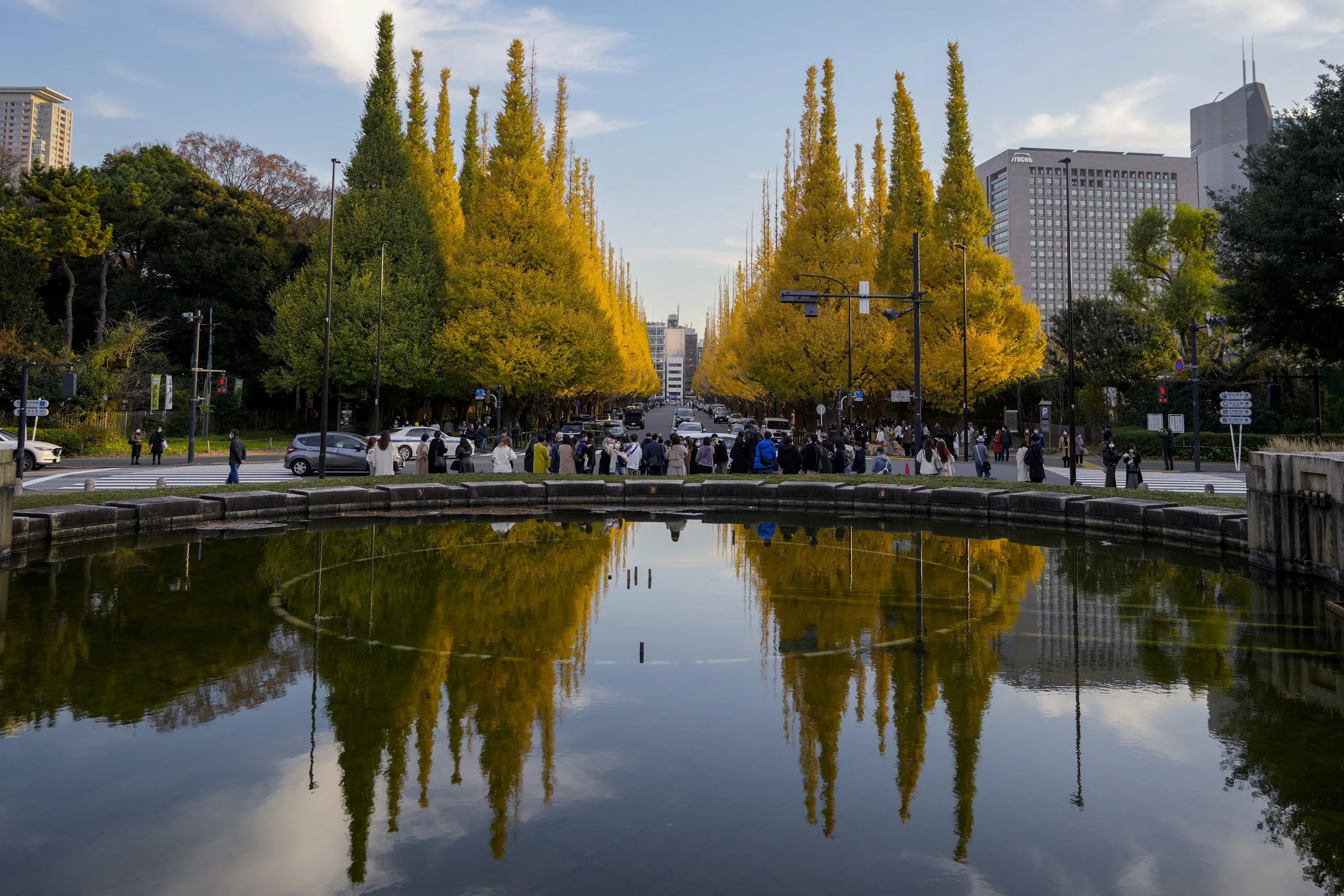People wearing protective masks to help curb the spread of the coronavirus walk through the row of ginkgo trees along a sidewalk as the trees and sidewalk are covered with the bright yellow leaves Monday, November 29, 2021, in Tokyo. (Photo by Kiichiro Sato/AP Photo)
