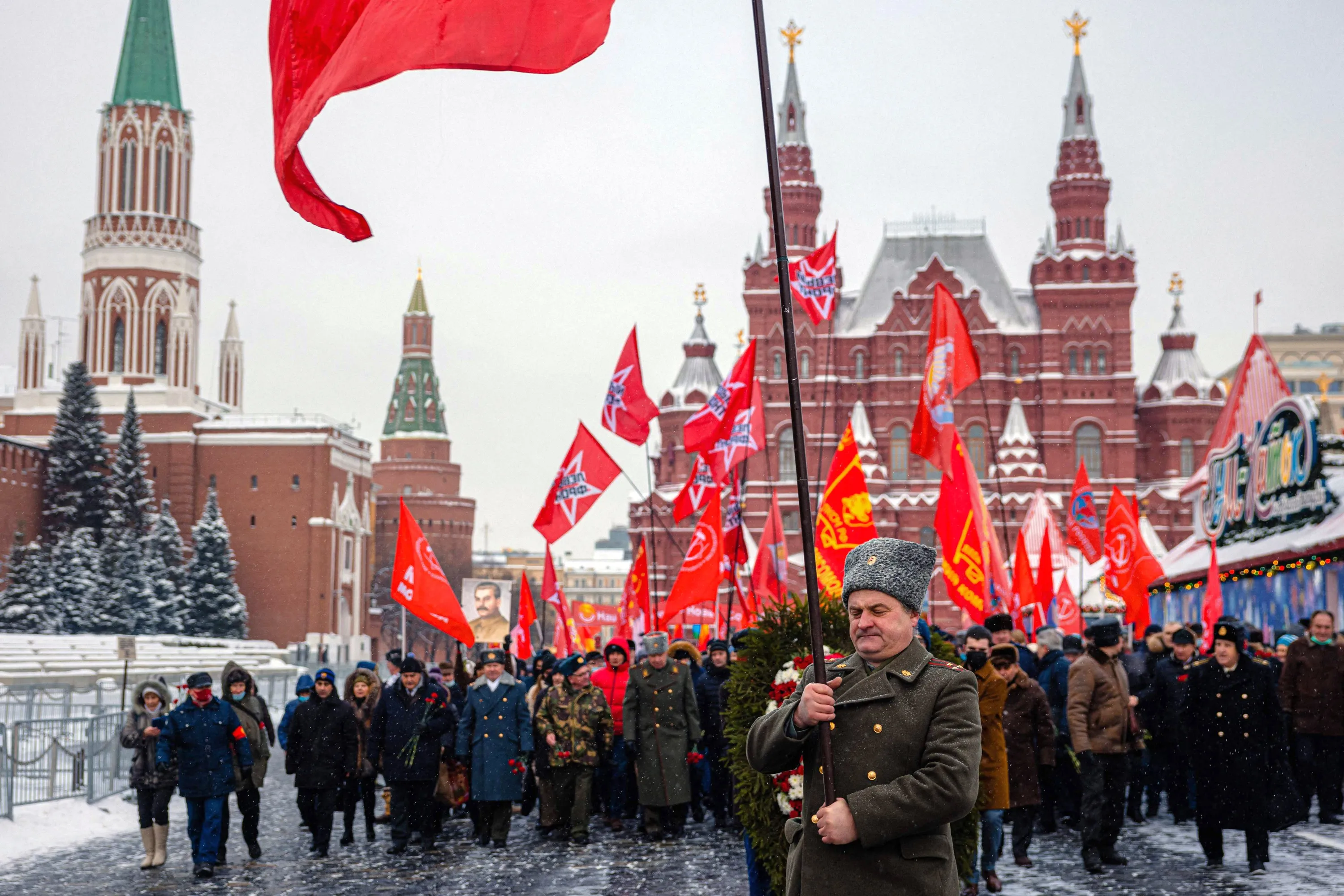 Russian Communist party supporters march to lay flowers to the tomb of late Soviet leader Joseph Stalin during a memorial ceremony to mark the 142nd anniversary of his birth at Red Square in Moscow on December 21, 2021. While historians blame Stalin for the deaths of millions in purges, prison camps and forced collectivization, many in Russia still praise him for leading the Soviet Union to victory over Nazi Germany in World War II. (Photo by Dimitar Dilkoff/AFP Photo)