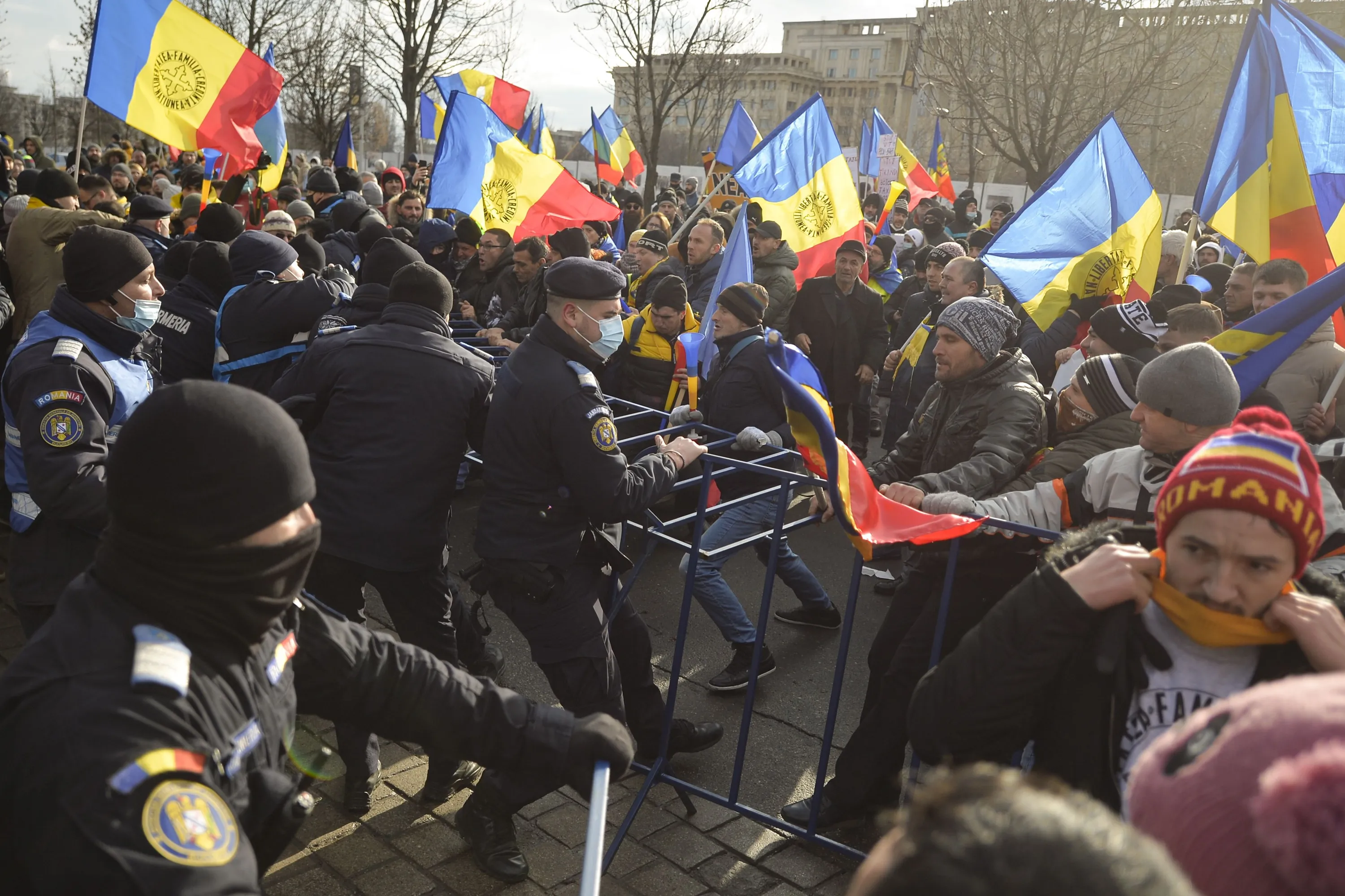 Riot police officers scuffle with anti-COVID-19 green pass protesters at the Palace of Parliament in Bucharest, Romania, Tuesday, December 21, 2021. People gathered to protest agains the introduction of the COVID-19 “green certificate” in work places, a measure considered by authorities to limit the coronavirus infections. (Photo by Alexandru Dobre/AP Photo)