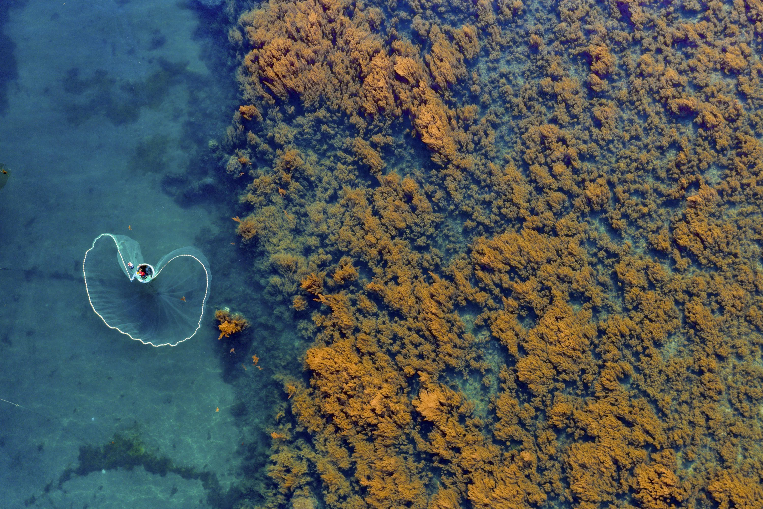 A fisherman casts his net near Quy Nhon City in Vietnam on October 20, 2021. Each morning they row out in one-person coracles in search of squid. (Photo by Nguyen Minh Tu/Solent News)