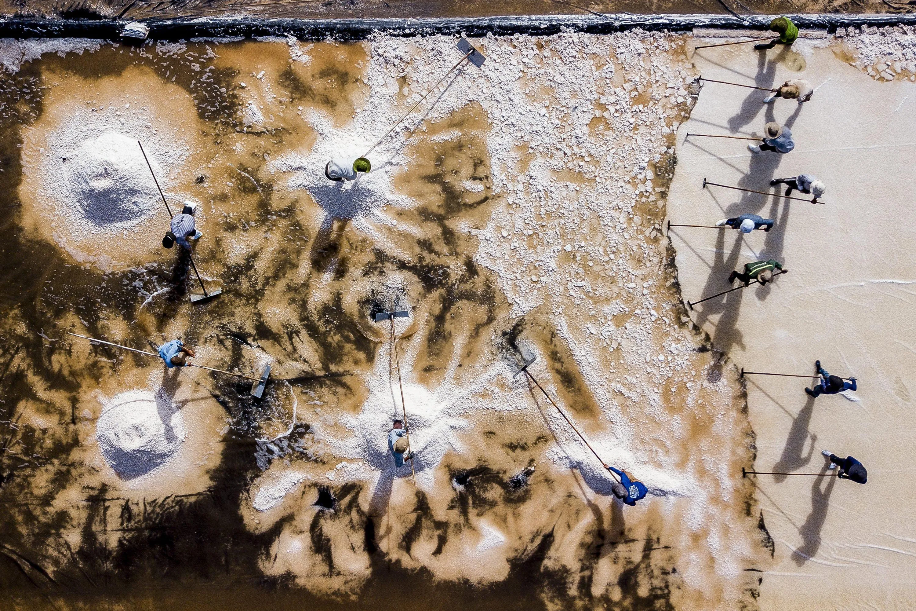 Workers at a salt field in Bac Lieu province, Vietnam, create powdery patterns as they rake salt into huge piles on November 1, 2021. About 20 people work in temperatures reaching 37°C. (Photo by Nguyen Tran Thanh Nha/Solent News)