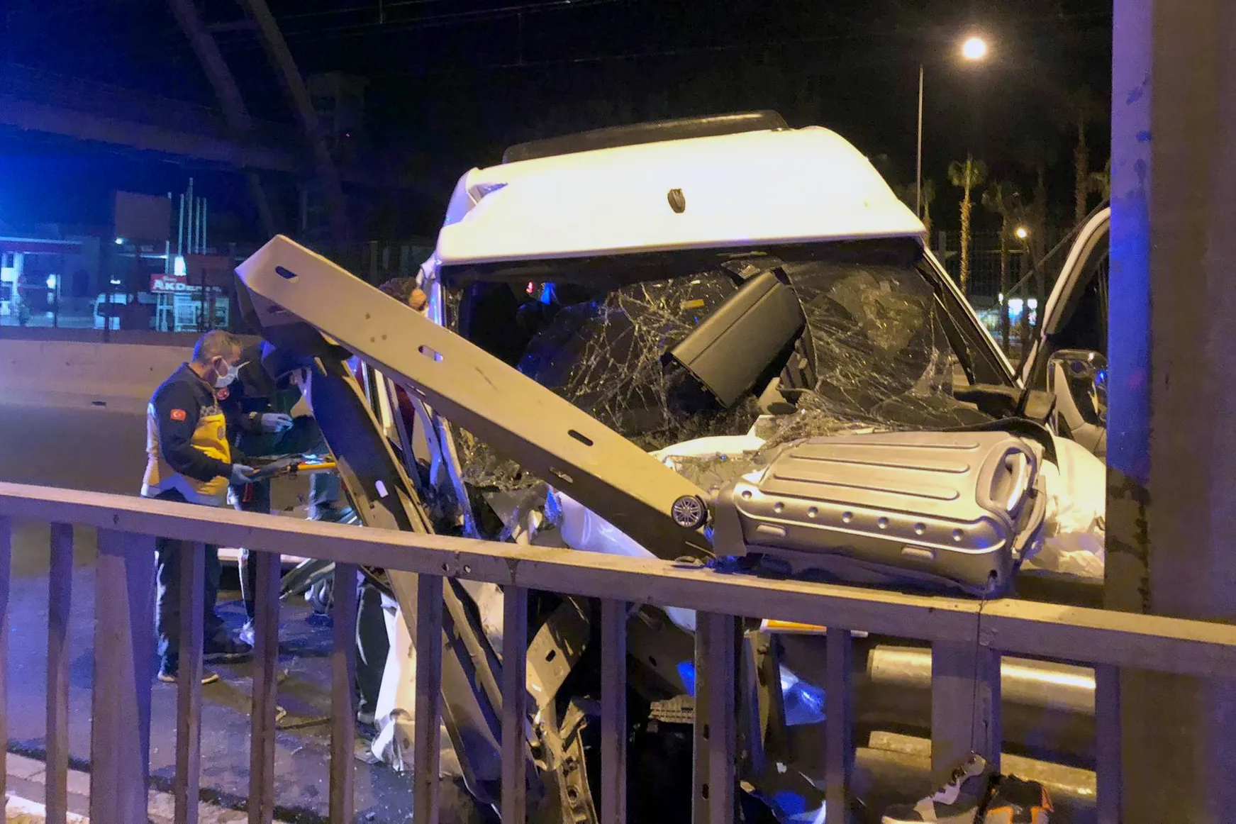 Turkish officials investigate after a minibus crashed near Aksu, in Antalya, Turkey, early Saturday, October 30, 2021. (Photo by IHA Agency via AP Photo)