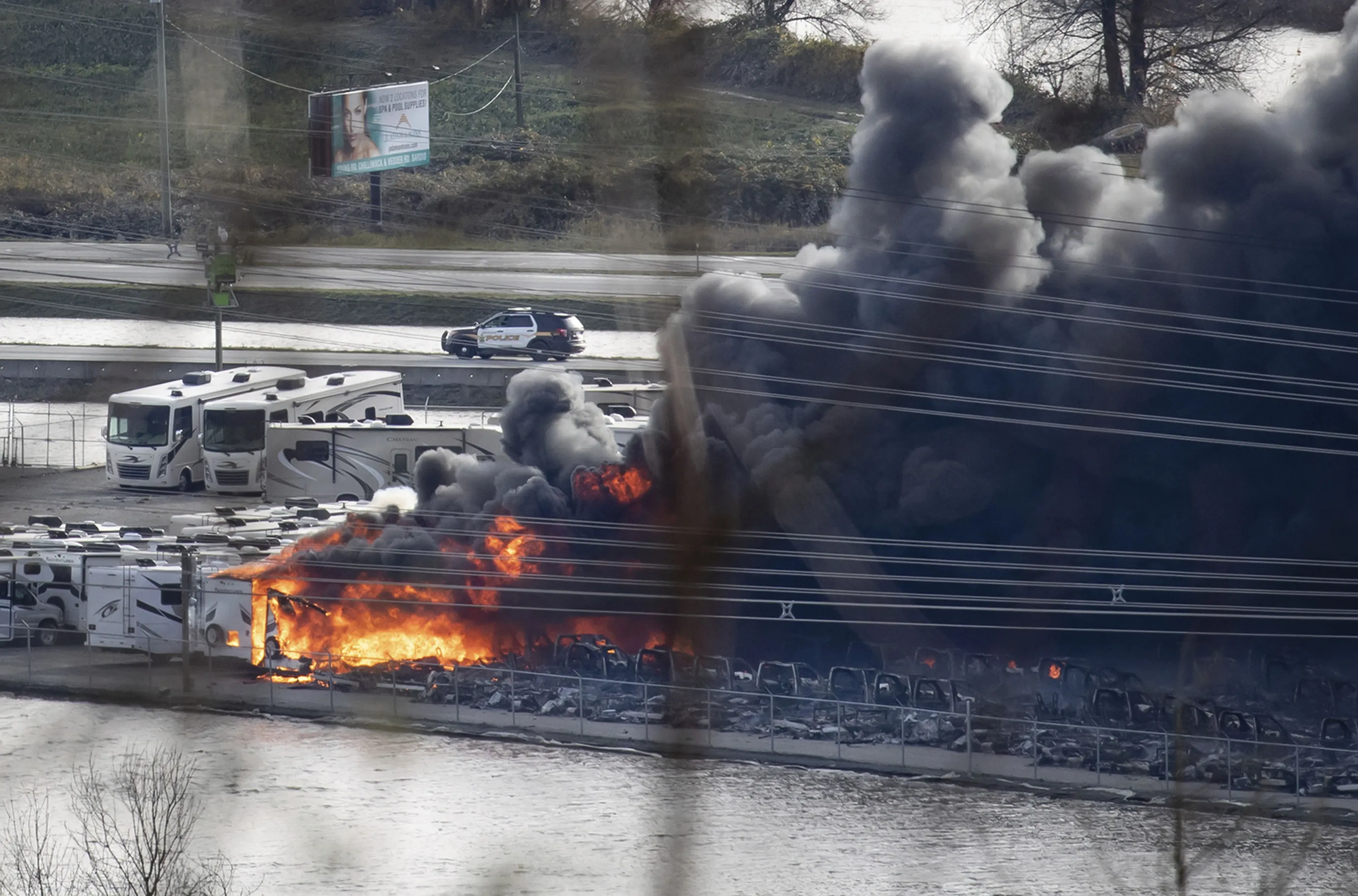 Recreational vehicles burn during a fire at a business surrounded by floodwaters in Abbotsford, British Columbia, on Wednesday, November 17, 2021. (Photo by Darryl Dyck/The Canadian Press via AP Photo)
