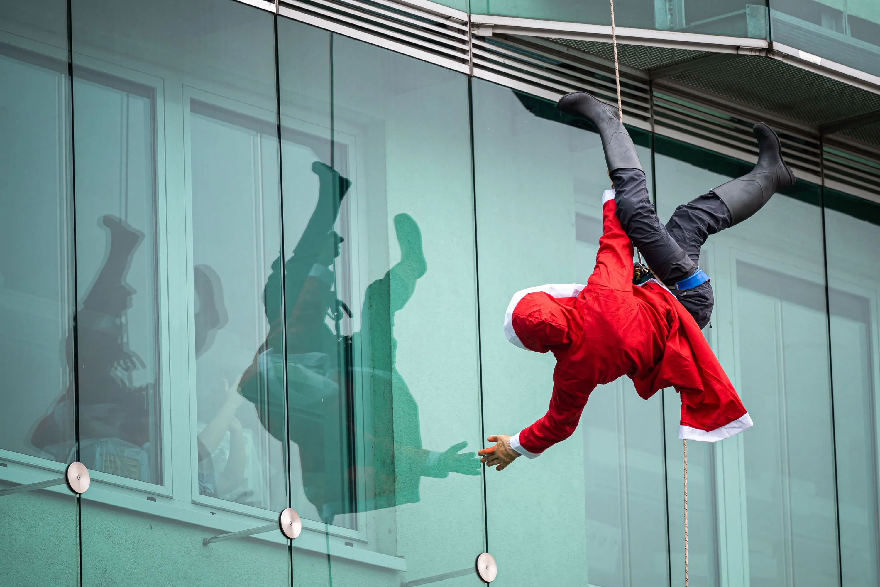 A climber disguised as Santa Claus goes down a paediatric clinic building in Ljubljana on December 22, 2021. (Photo by Jure Makovec/AFP Photo)