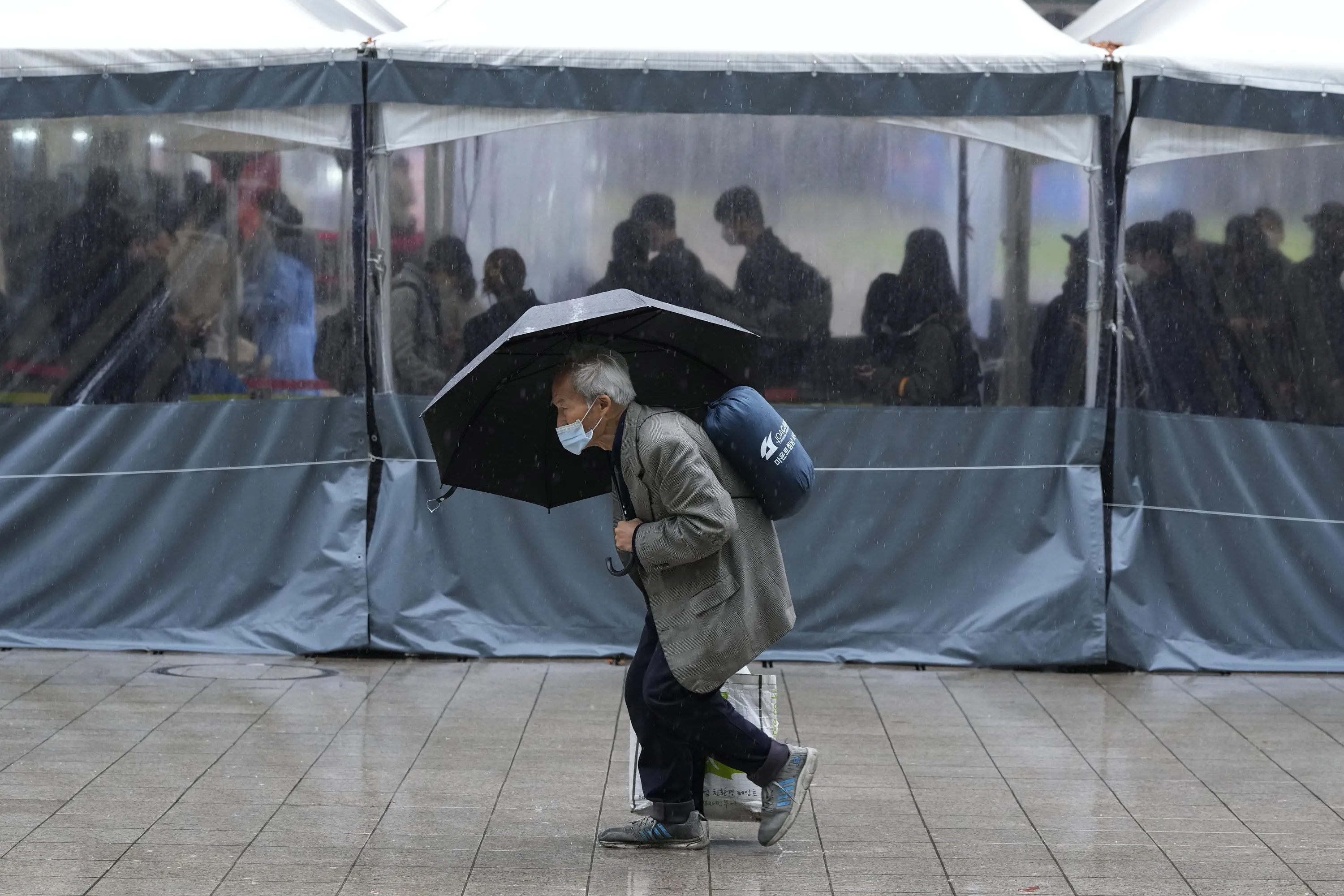 A man wearing a face mask passes by a makeshift COVID-19 testing site in Seoul, South Korea, Tuesday, November 30, 2021. (Photo by Ahn Young-joon/AP Photo)