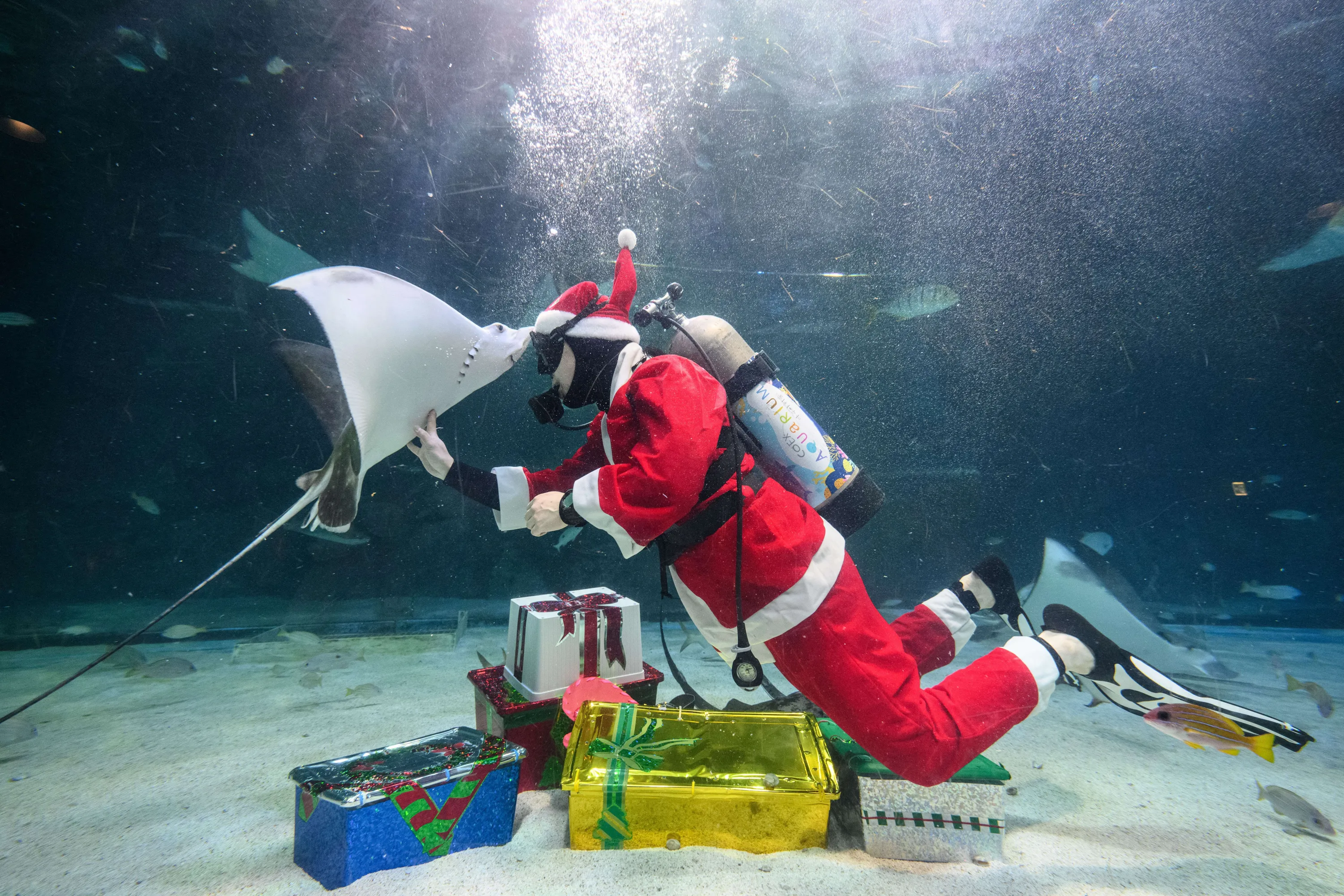 A diver dressed as Santa Claus performs during a Christmas-themed underwater show at the COEX aquarium in Seoul on December 3, 2021. (Photo by Anthony Wallace/AFP Photo)