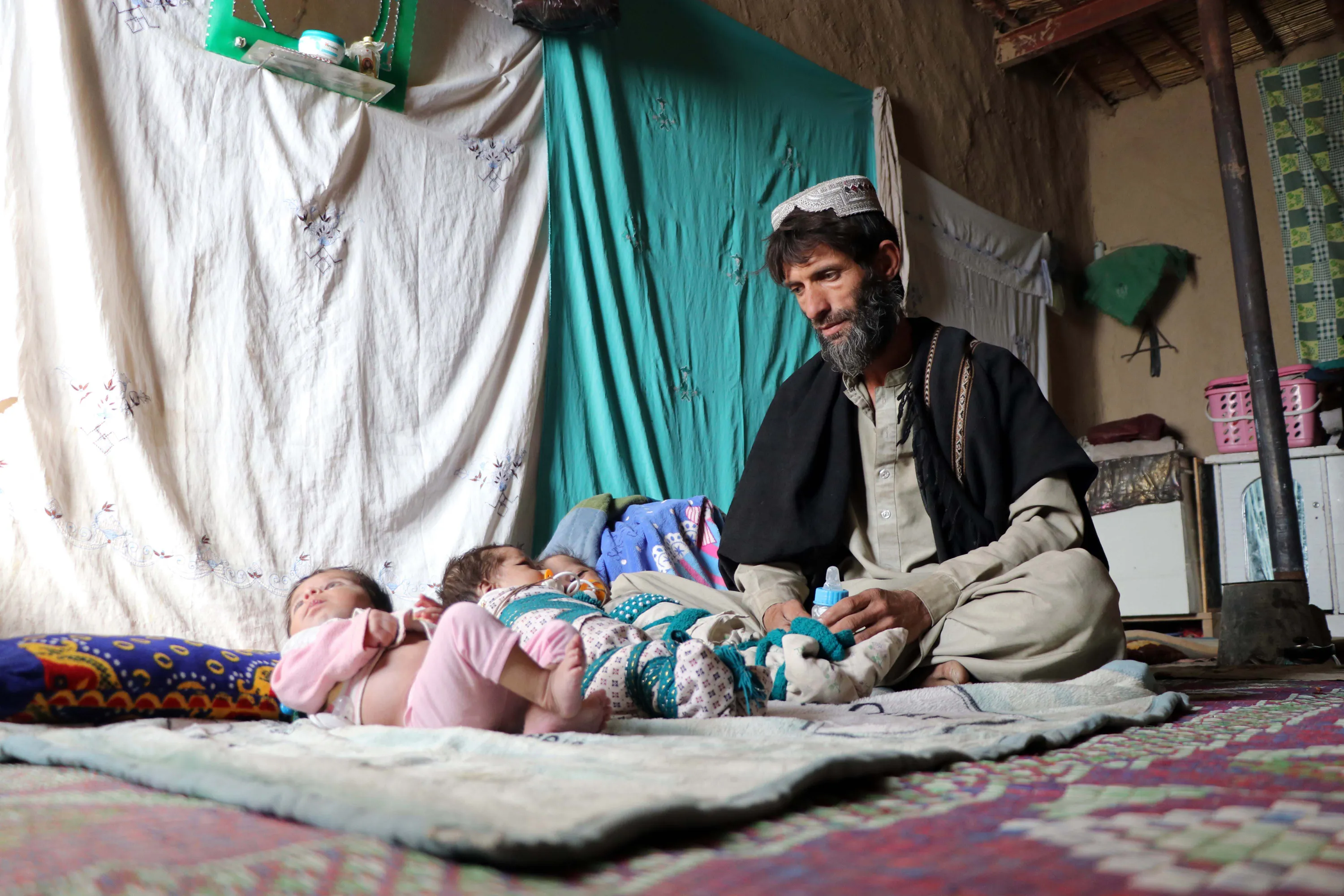 Ehsanullah, a father or newborn triplets sons sit next to his babies at his home in Kandahar, Afghanistan, 06 December 2021. Ehsanullahl said he was grateful to Allah for blessing him with three sons. However, he complained poverty made it difficult for him to look after them. The United Nations World Food Program (WFP) urgently called for 2.6 billion USD to address the serious humanitarian crisis in Afghanistan, where the lives of 3.2 million children face hunger and malnutrition. (Photo by EPA/EFE/Stringer)
