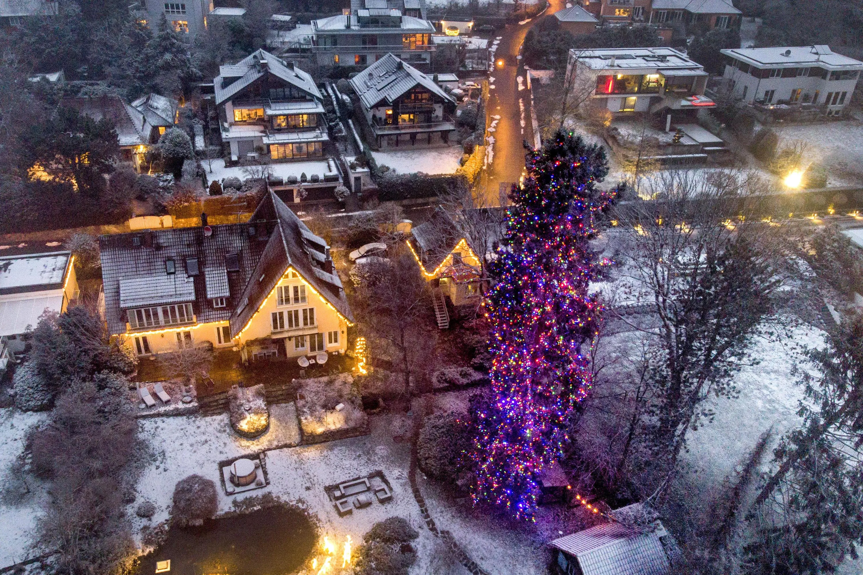 A giant Douglas fir is decorated with Christmas lights in a garden of a house in the small village of Falkenstein near Falkenstein, Germany, Friday, December 10, 2021. (Photo by Michael Probst/AP Photo)