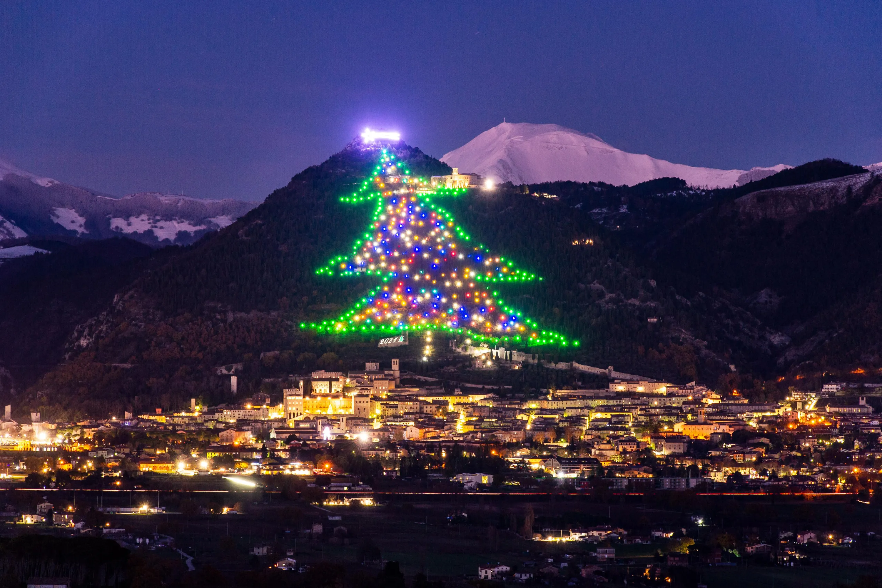 A Christmass tree shaped lighting decorates the slopes of Mount Ingino in Gubbio, Perugia district, central Italy on December 13, 2021. This world’s largest Christmas tree, has held the world record since 1991. It is 750 metres tall and 450 metres wide. (Photo by CICO/ROPI via ZUMA Press Wire/EYEVINE)