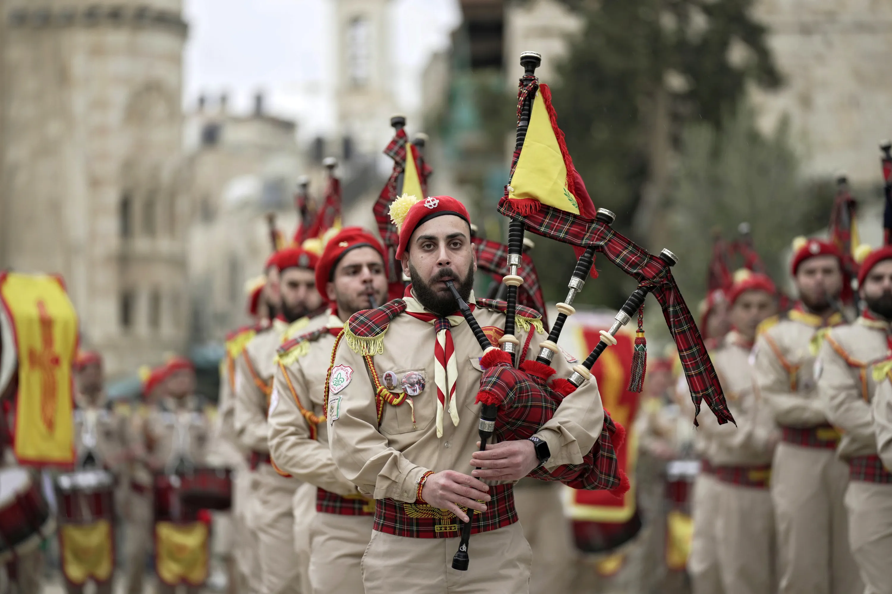 Palestinian scout band members parade through Manger Square at the Church of the Nativity, traditionally believed to be the birthplace of Jesus Christ, during Christmas celebrations, in the West Bank city of Bethlehem, Friday, December 24, 2021. The biblical town of Bethlehem is gearing up for its second straight Christmas Eve hit by the coronavirus with small crowds and gray, gloomy weather dampening celebrations Friday in the traditional birthplace of Jesus. (Photo by Majdi Mohammed/AP Photo)