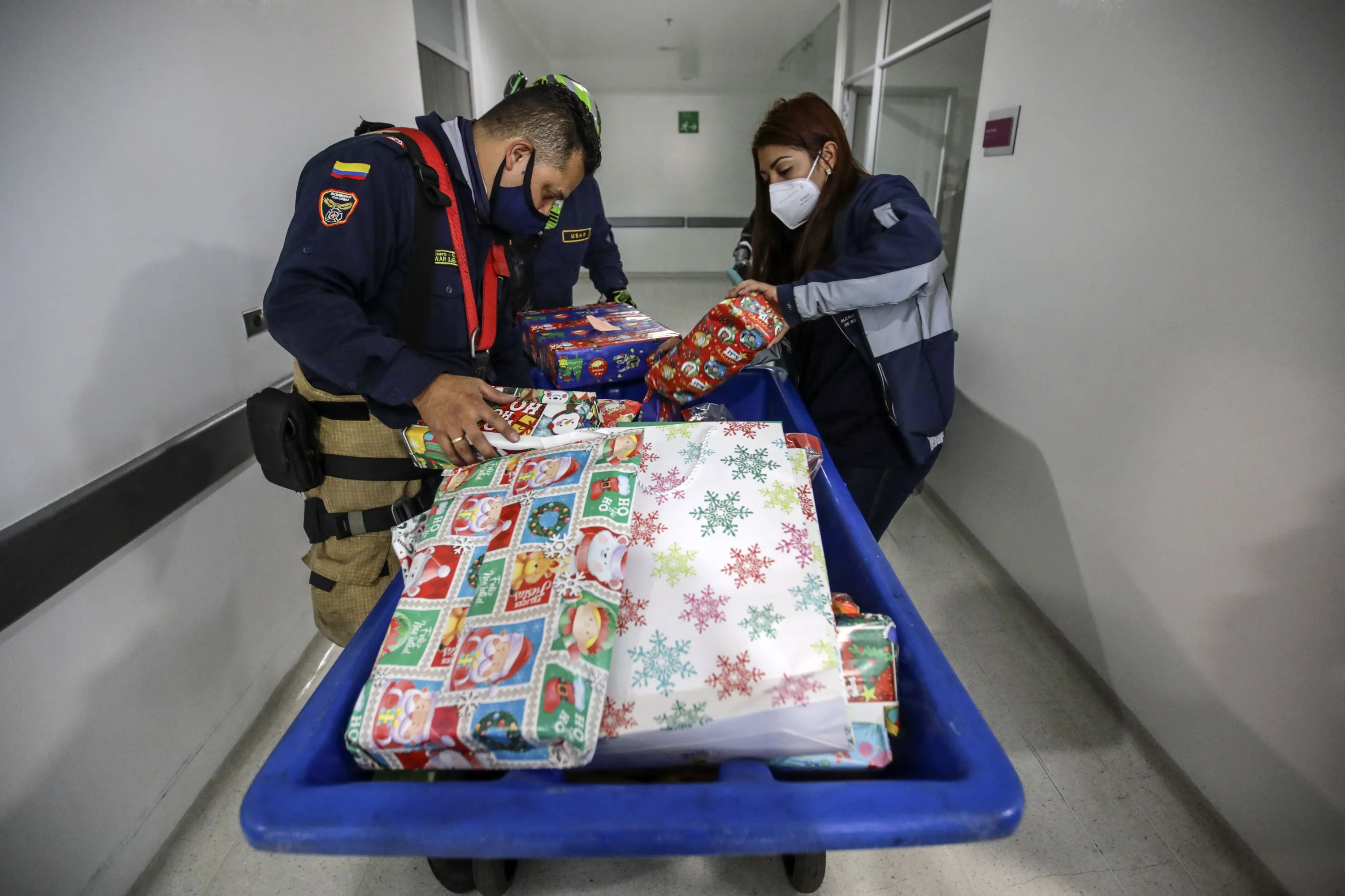 Members of the Bogota's fire department are dressed up as Santa Claus to bring Christmas presents to the kids who will spend Christmas at La Misericordia Pediatric Hospital in Bogota, Colombia on December 24, 2021. (Photo by Juancho Torres/Anadolu Agency via Getty Images)