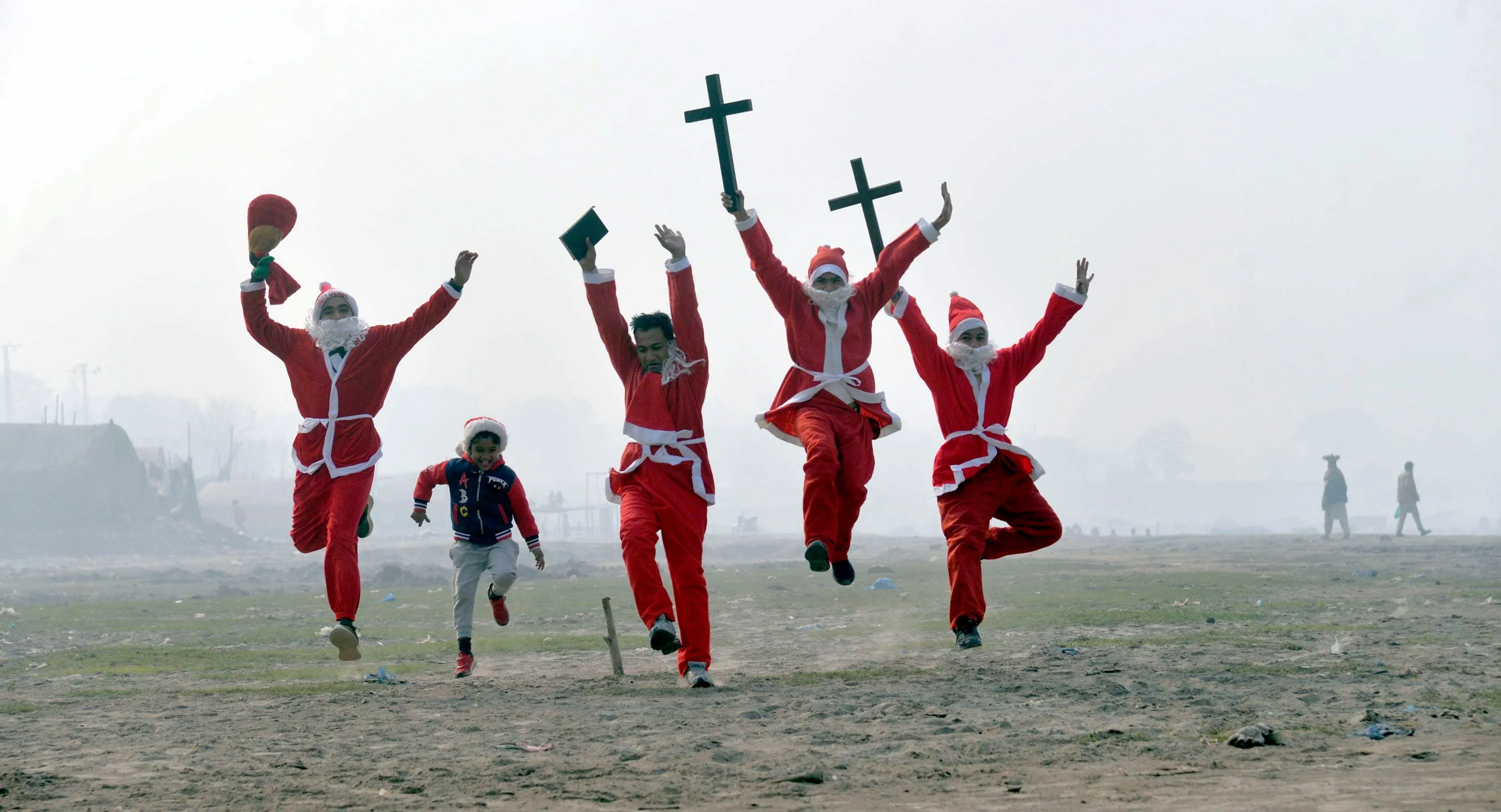 Pakistani members of Bright Future Society and IMRF wearing costumes of Santa Claus boating at river Ravi and distributing sweets among gypsy children's ahead of Christmas celebrations in Lahore on December 24, 2021. Christian community across the country has started preparing to celebrate the festive season of “Christmas” with the advent of December. The Christians have started illuminating their homes and churches while Christmas shopping is in full swing all over the country. (Photo by Rana Sajid Hussain/Pacific Press/Rex Features/Shutterstock)