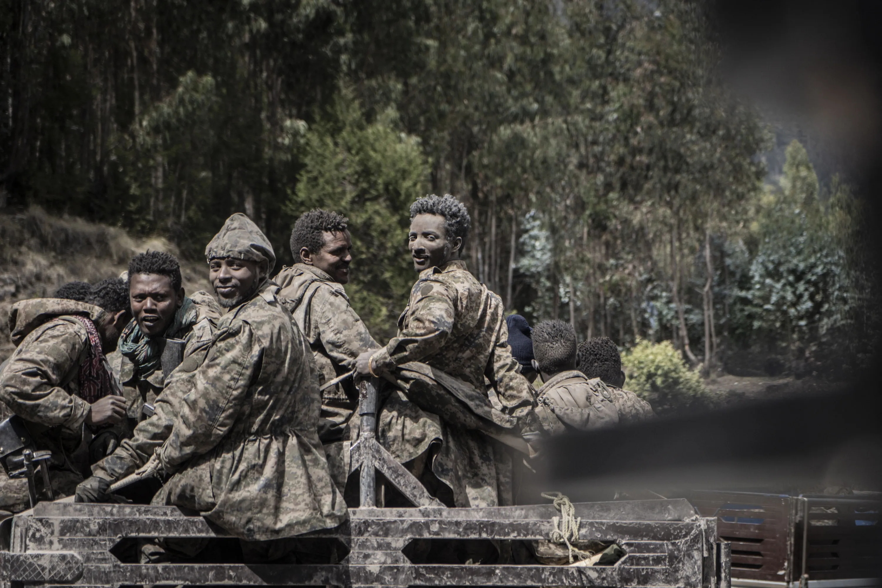 Members of the Ethiopian National Defense Force (ENDF) are seen on a truck in Shewa Robit, Ethiopia, on December 05, 2021. (Photo by Amanuel Sileshi/AFP Photo)