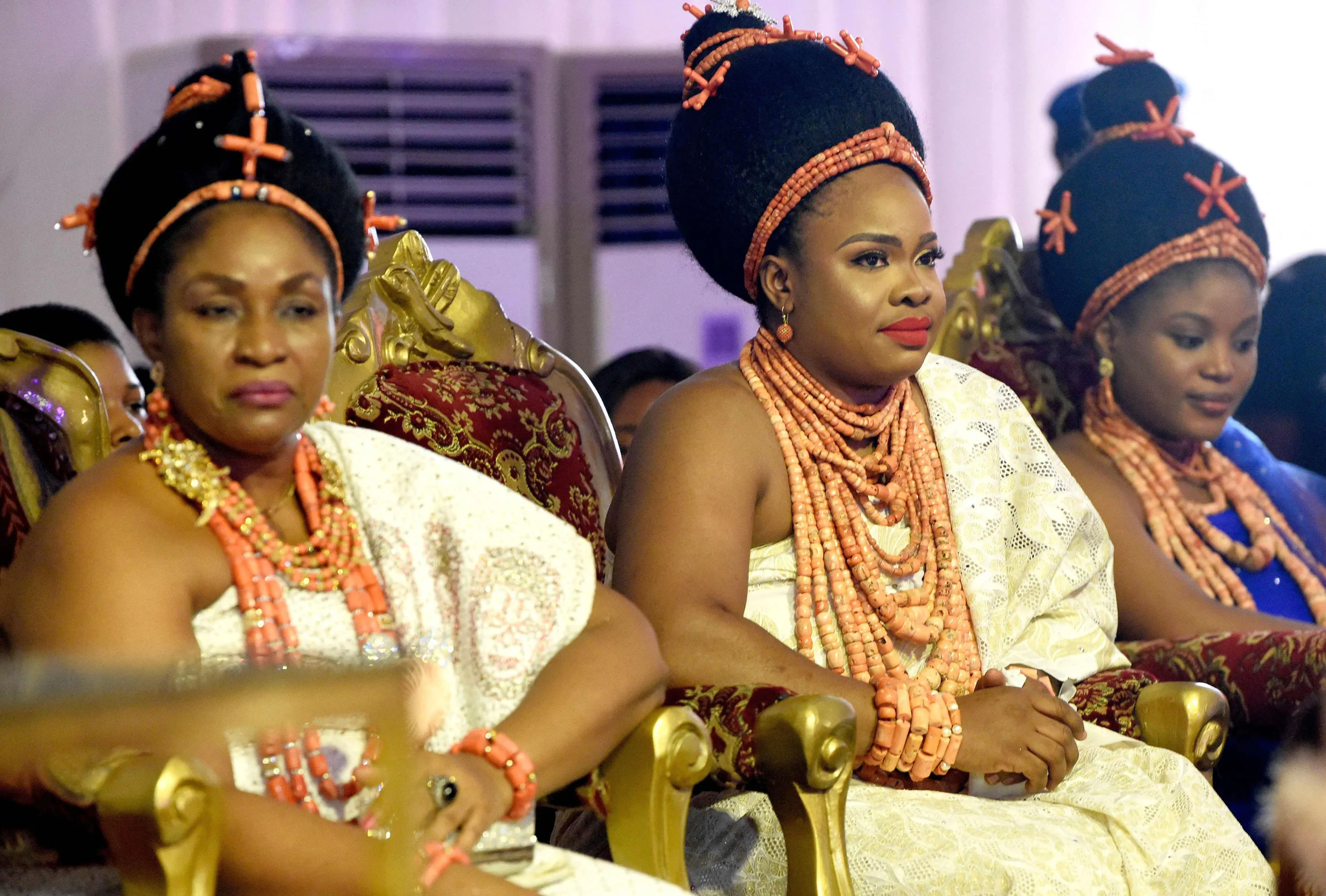 Wives of King Oba of Benin, Omo n’Oba N’Edo Uku Akpolokpolo, Ewuare II, attend the signing of documents for the repartriation to the ancient kingdom of looted artefacts by the British military force in Benin City, midwestern Nigeria, on December 13, 2021. Oba of Benin has signed relevant documents for the repatriation to the ancient kingdom of precious artefacts looted by the British soldiers during the punitive military campaign in Benin City in 1897. (Photo by Pius Utomi Ekpei/AFP Photo)