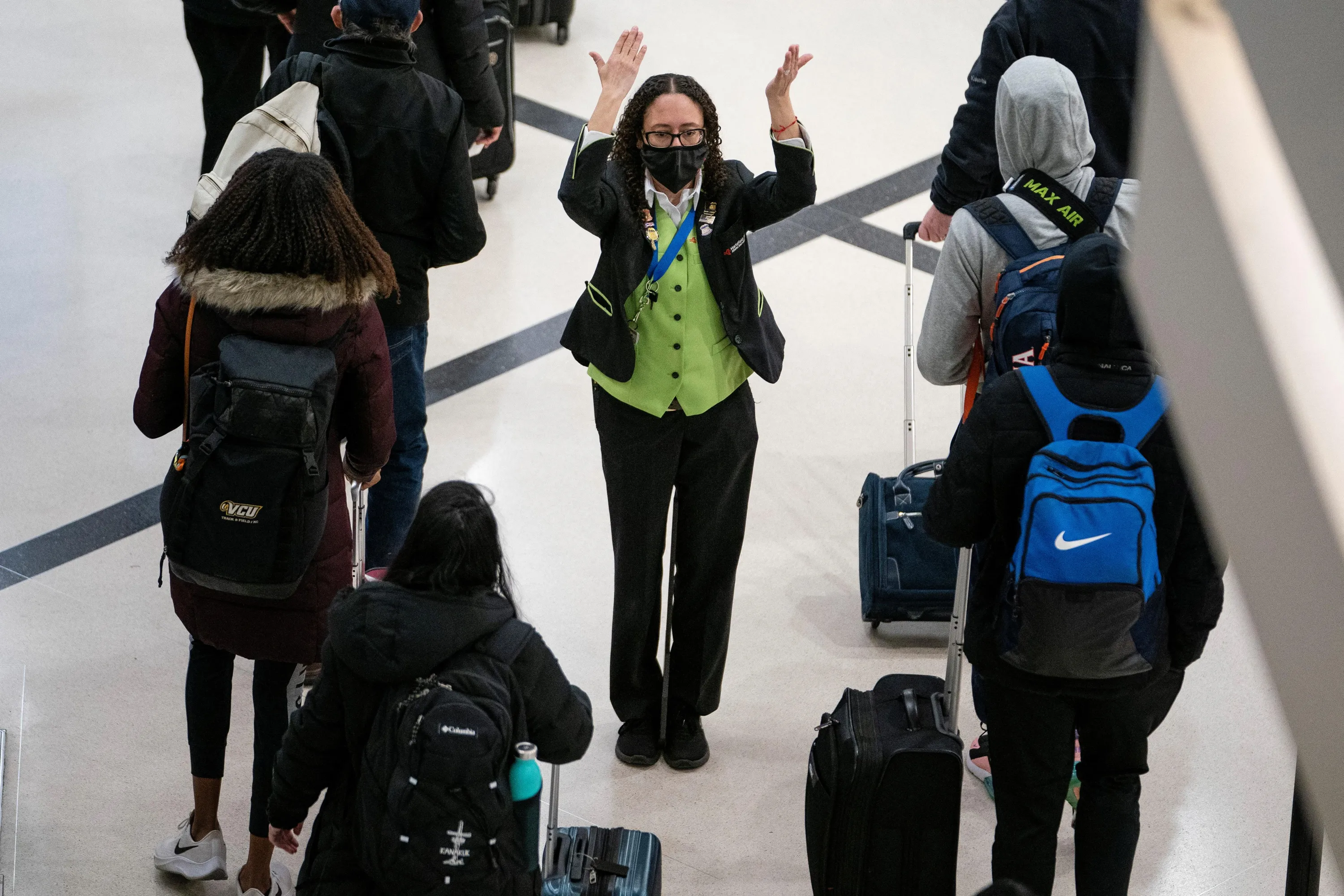 An airport employee gestures to lines of travelers outside a TSA security checkpoint during the holiday season as the coronavirus Omicron variant threatens to increase case numbers at Hartsfield-Jackson Atlanta International Airport in Atlanta, Georgia, U.S. December 22, 2021. (Photo by Elijah Nouvelage/Reuters)