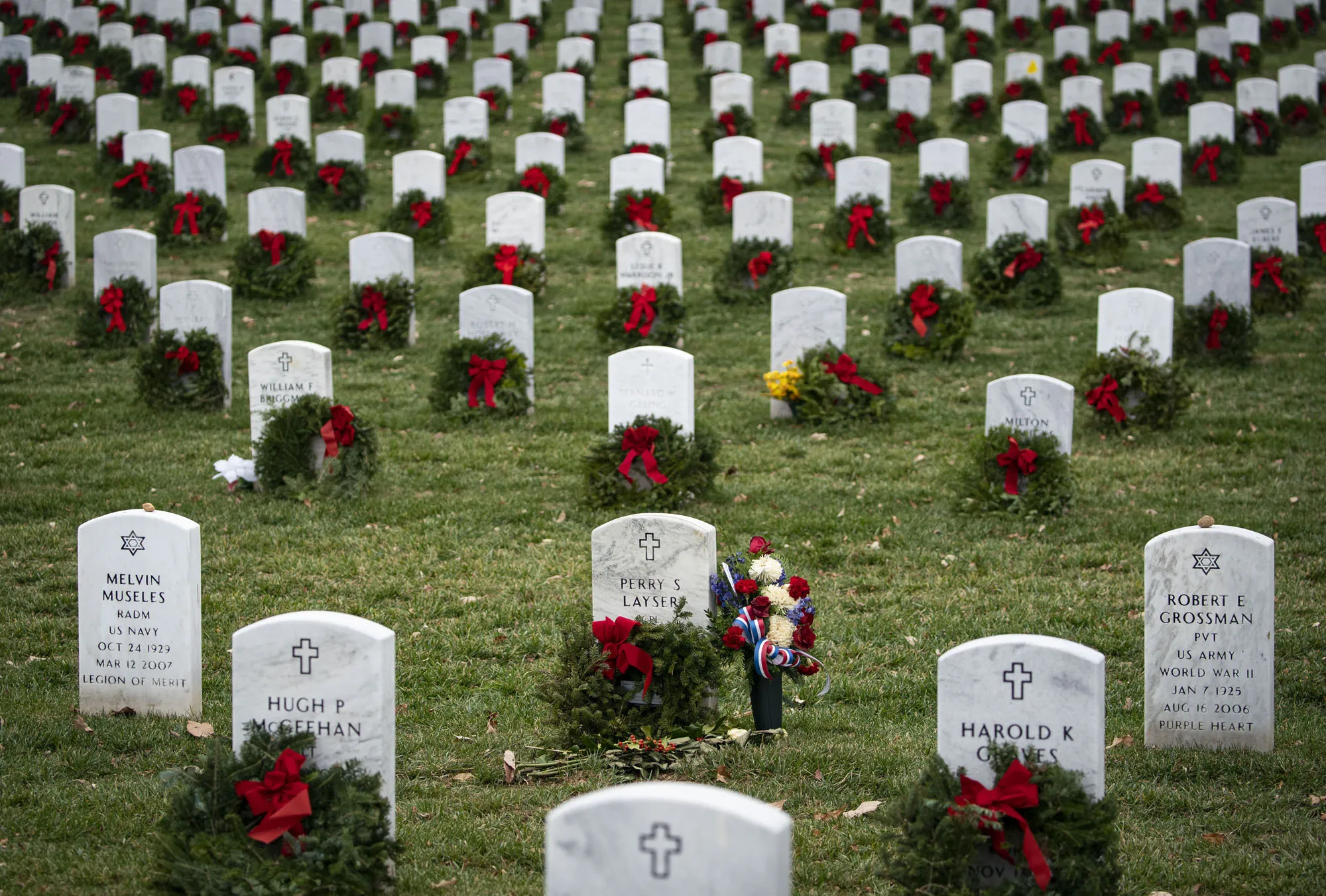 Balsam fir wreaths lie on tombstones in Section 60 at Arlington National Cemetery, on December 18, 2021 in Arlington, Virginia. The 30th annual “Wreaths Across America” project places wreaths on the more than 250,000 tombstones of military servicemen and women at Arlington National Cemetery. (Photo by Al Drago/Getty Images)
