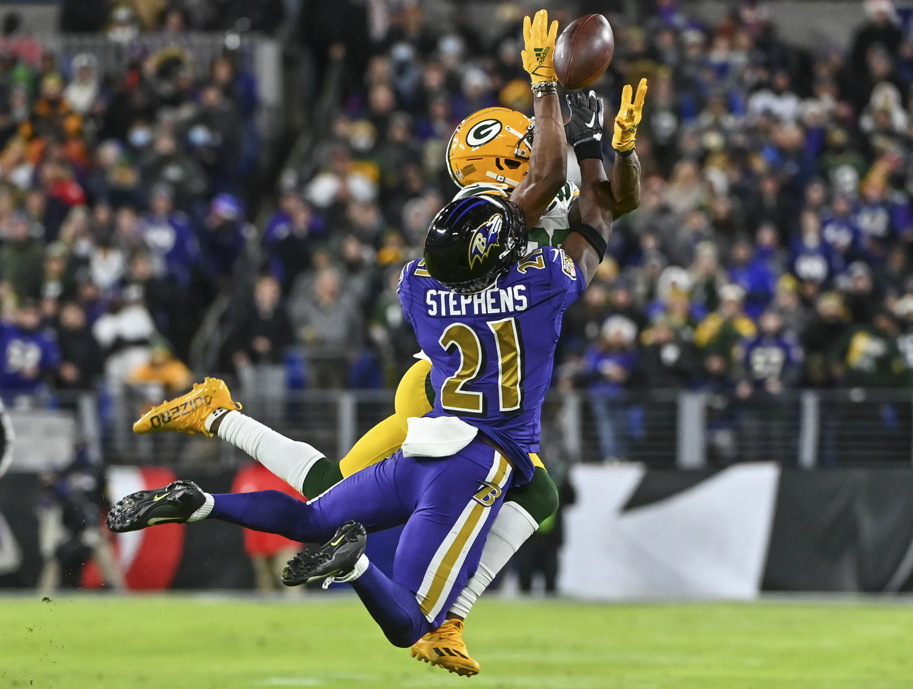 Baltimore Ravens free safety Brandon Stephens (21) breaks up a pass intended for Green Bay Packers wide receiver Marquez Valdes-Scantling (83) in the second quarter of the game between the Green Bay Packers and Baltimore Ravens at M&T Bank Stadium on December 19, 2021 in Baltimore, Md. (Photo by Ricky Carioti/The Washington Post)